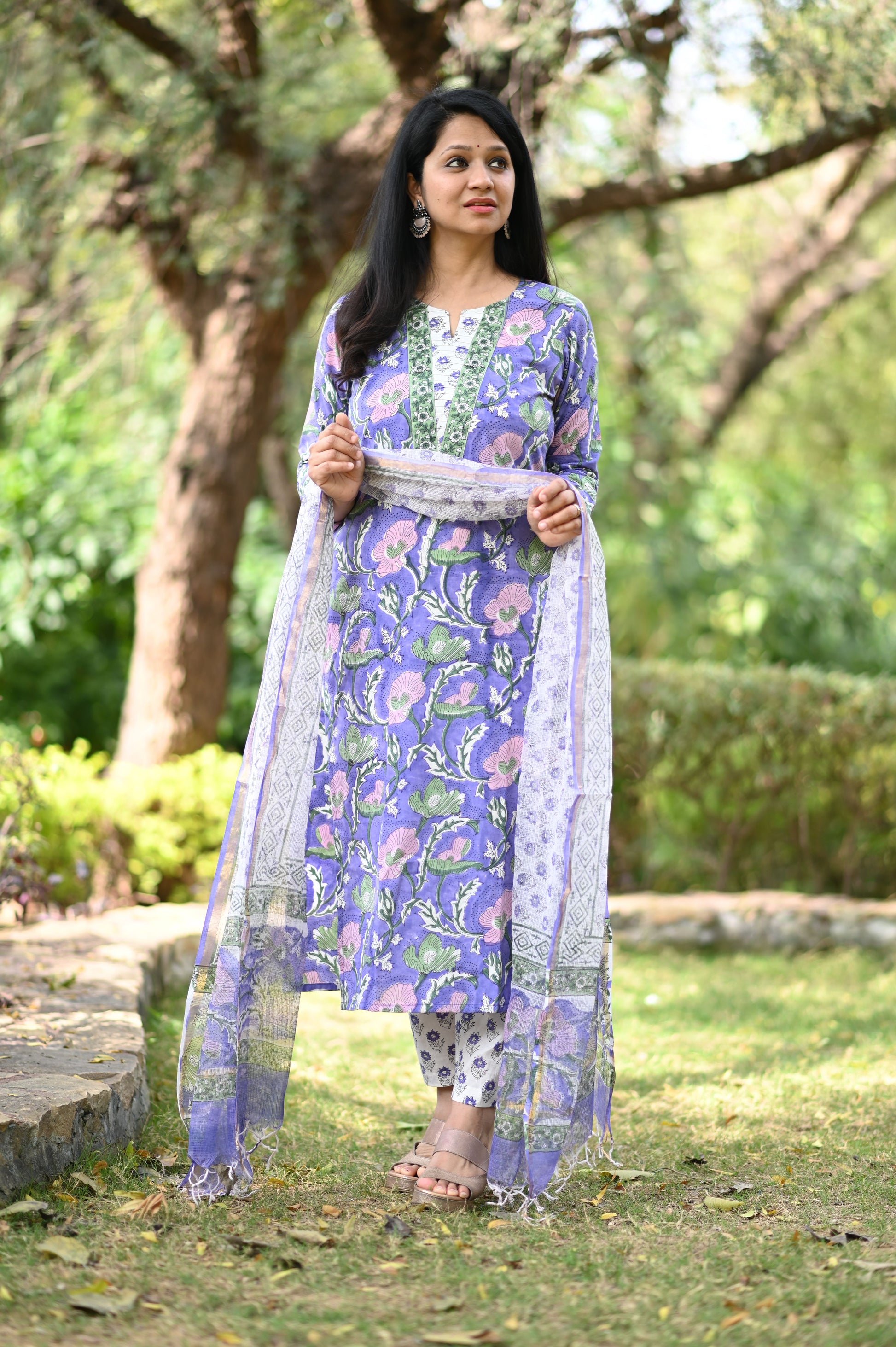This Designer Hand Block Cotton Suit Set features pure cotton floral printed fabric that has been dyed using natural vegetable dyes. The Pintucks Detailing adds a touch of artistry to this set, and it comes with a pure Kota Doria Dupatta for a complete and luxurious look.