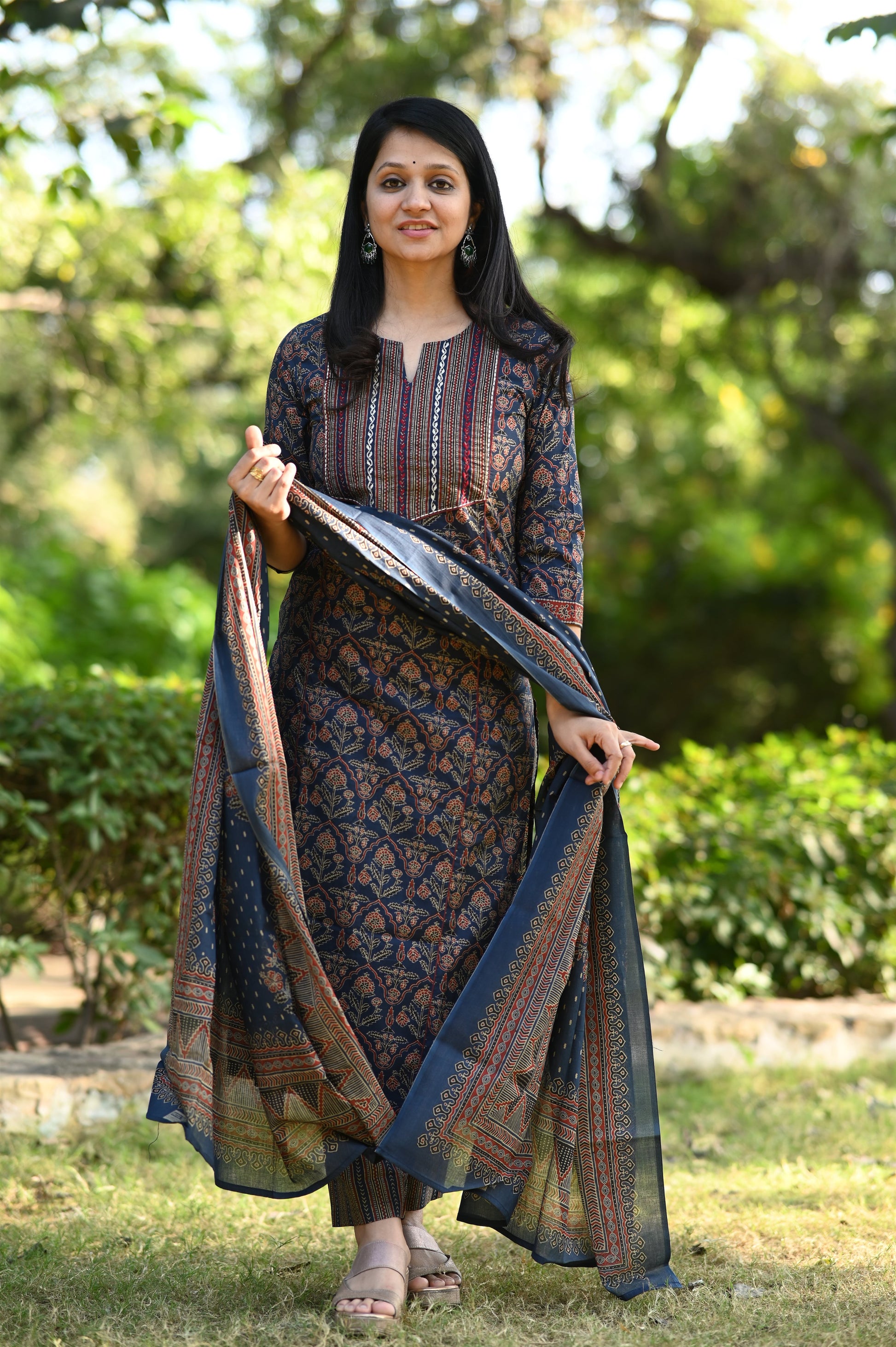 This designer cotton suit set features expert craftsmanship with minimalistic thread embroidery on the yoke. The Ajrakh Print adds a touch of sophistication, making it a must-have for fashion-forward individuals.