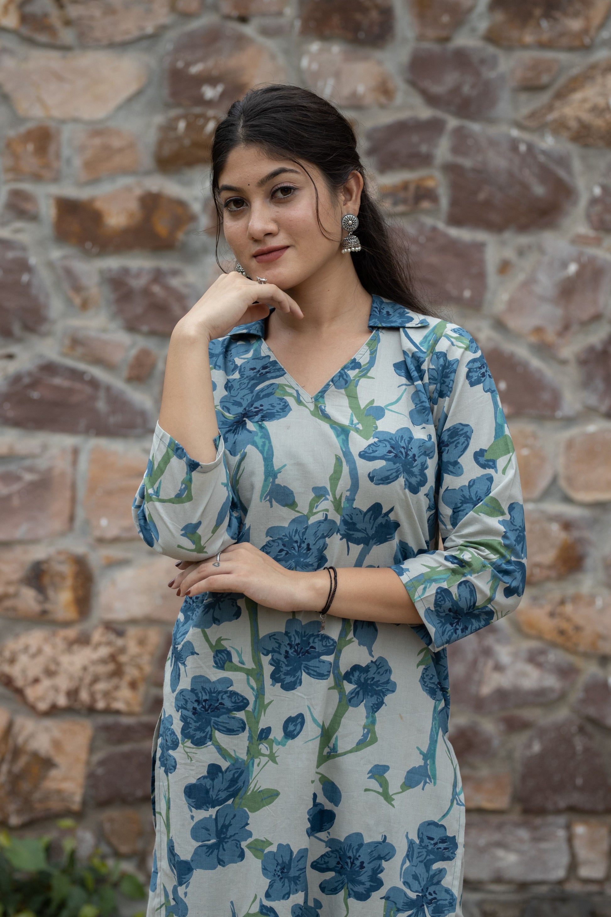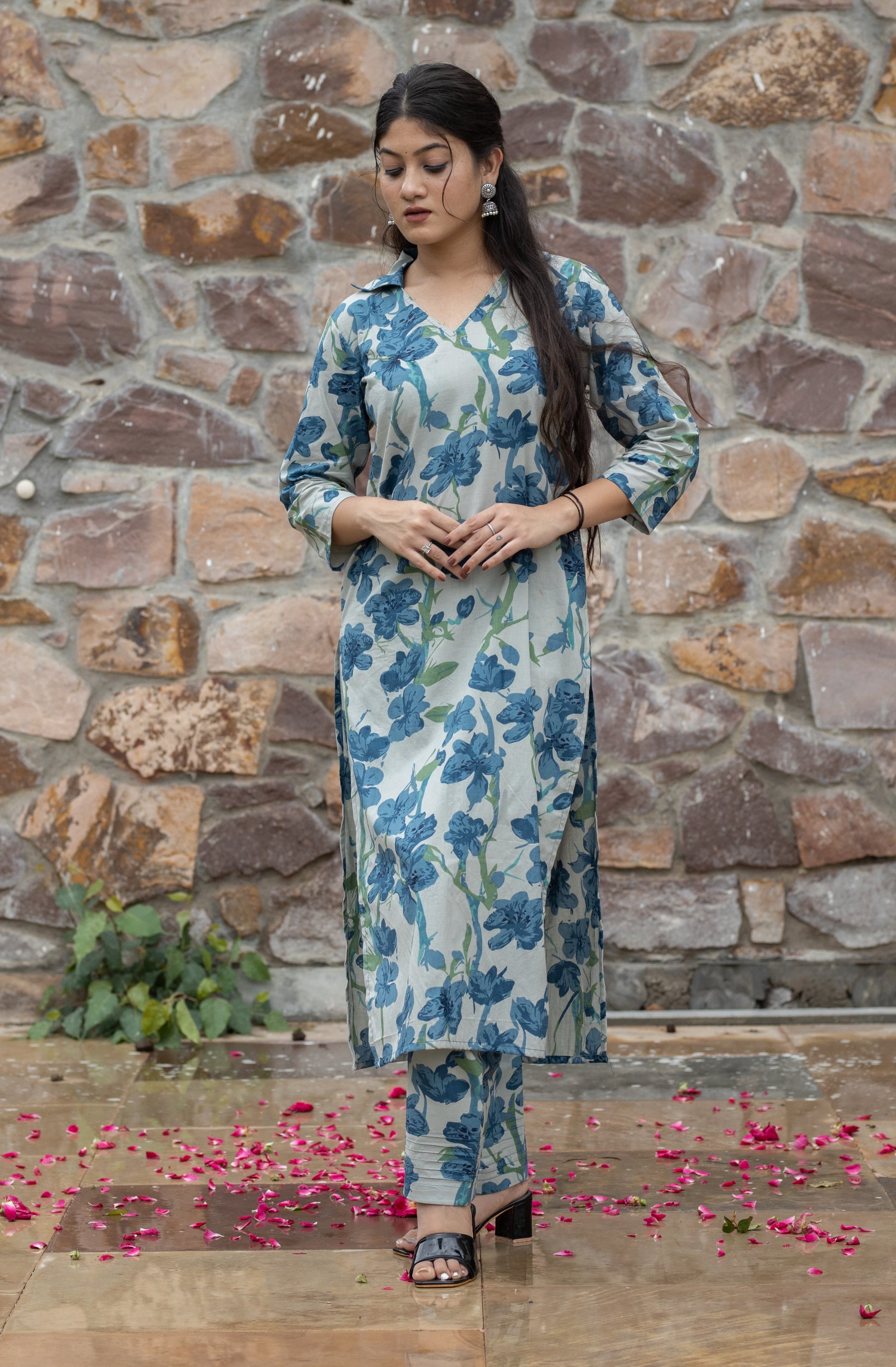 Complete your wardrobe with a stunning combination of traditional and modern styles. This Divita Kurta Pant Set features a unique half collar design and a vibrant discharge floral print, perfectly blending both elements for a fashion-forward look.