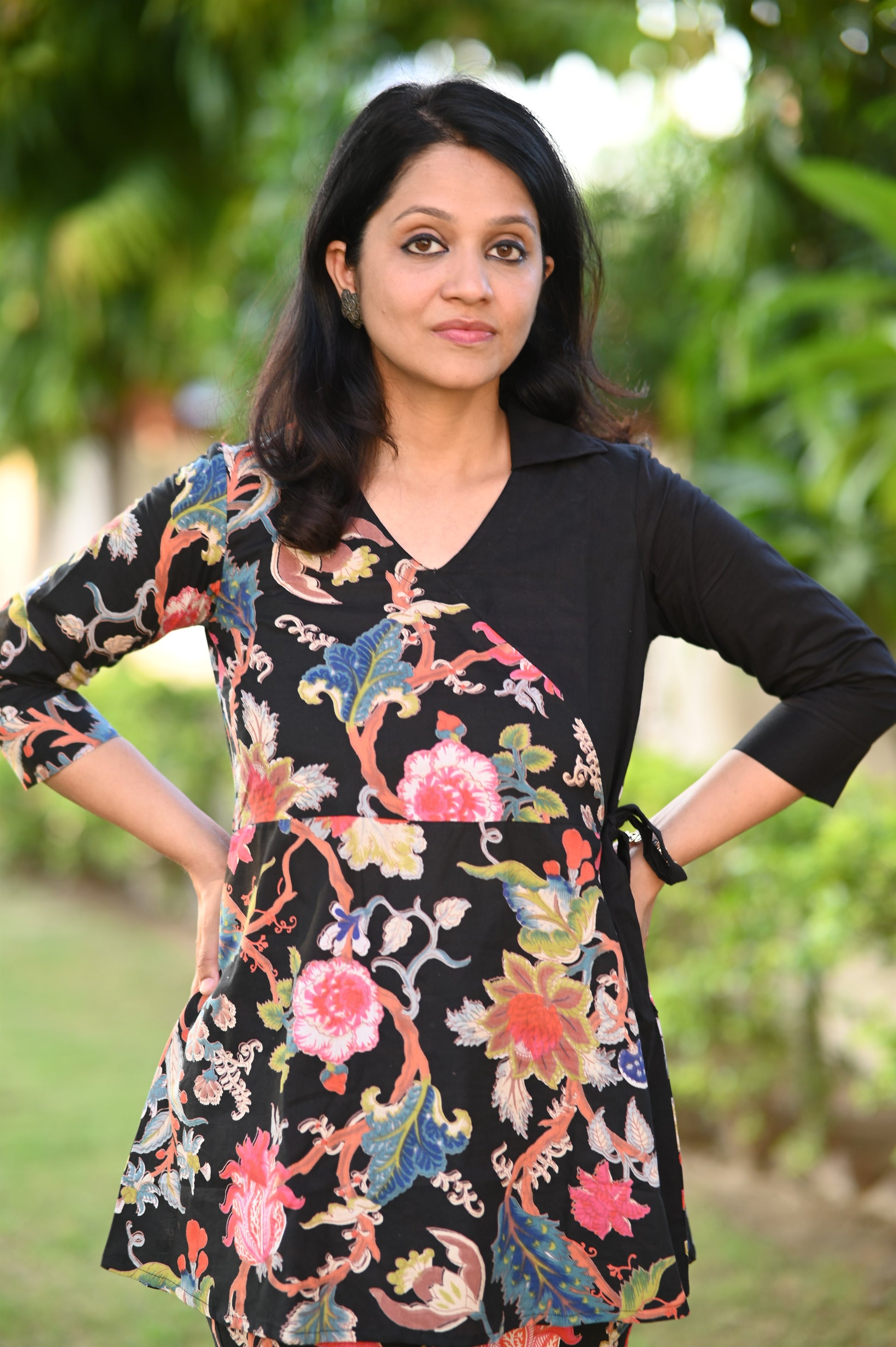 This stunning ensemble showcases a black-based floral print co-ord set with a chic tunic-style kurta. The figure-flattering silhouette is enhanced with three-quarter sleeves and a strikingly intricate floral design in a vibrant color palette of pinks, reds, greens, and blues. The coordinated pants feature a sleek, straight cut and carry the same bold floral motif, completing the cohesive and eye-catching look.