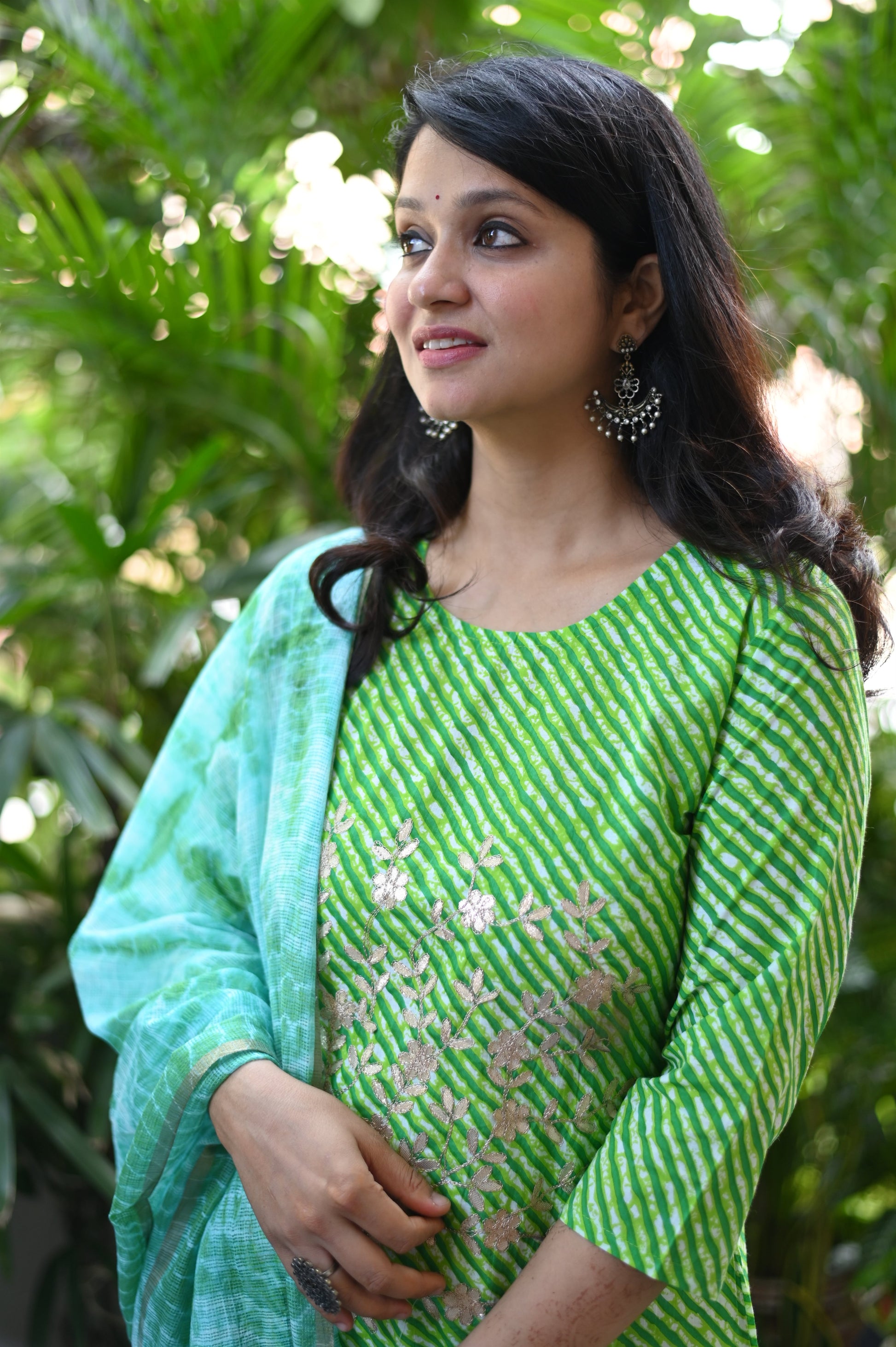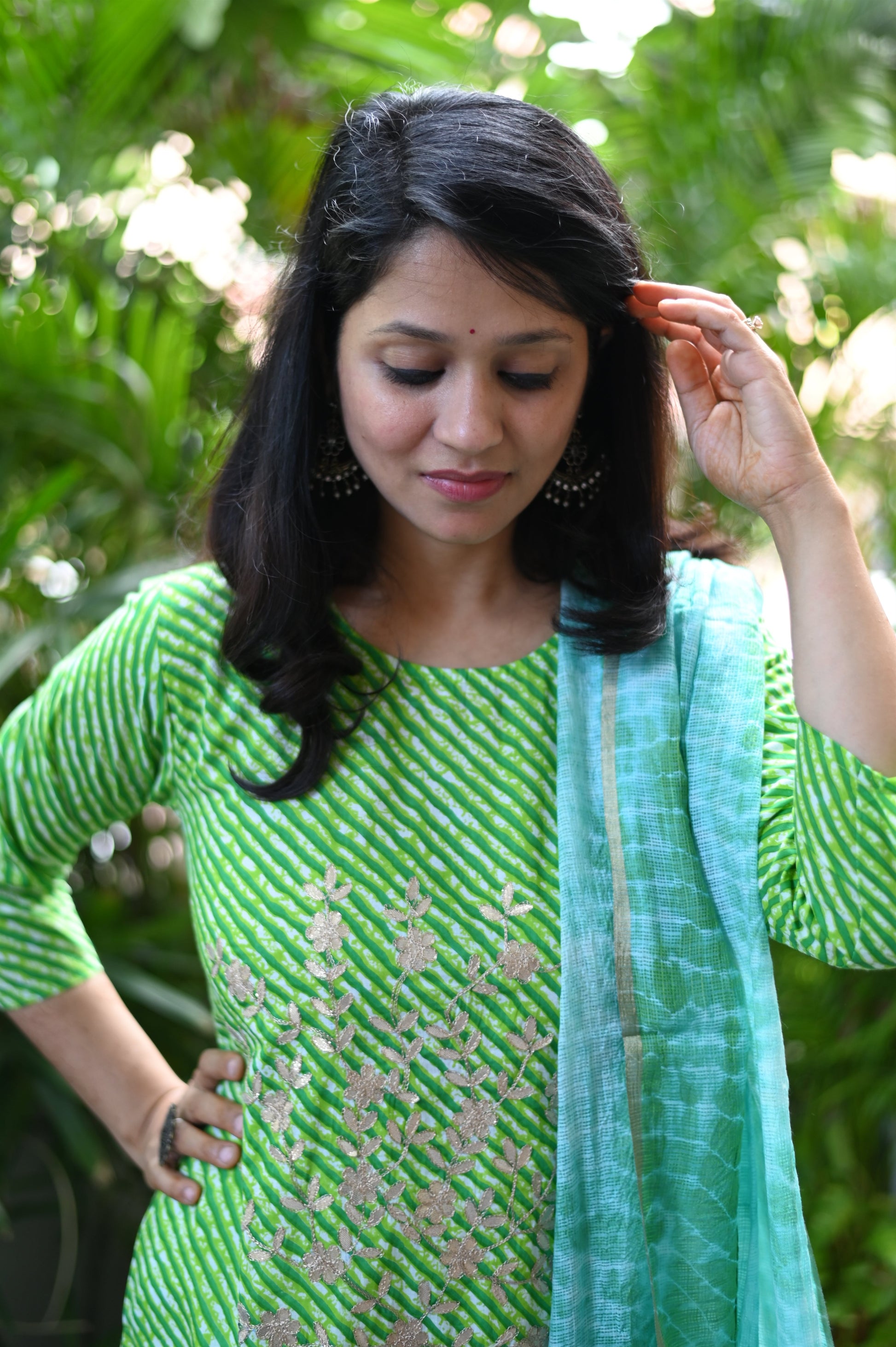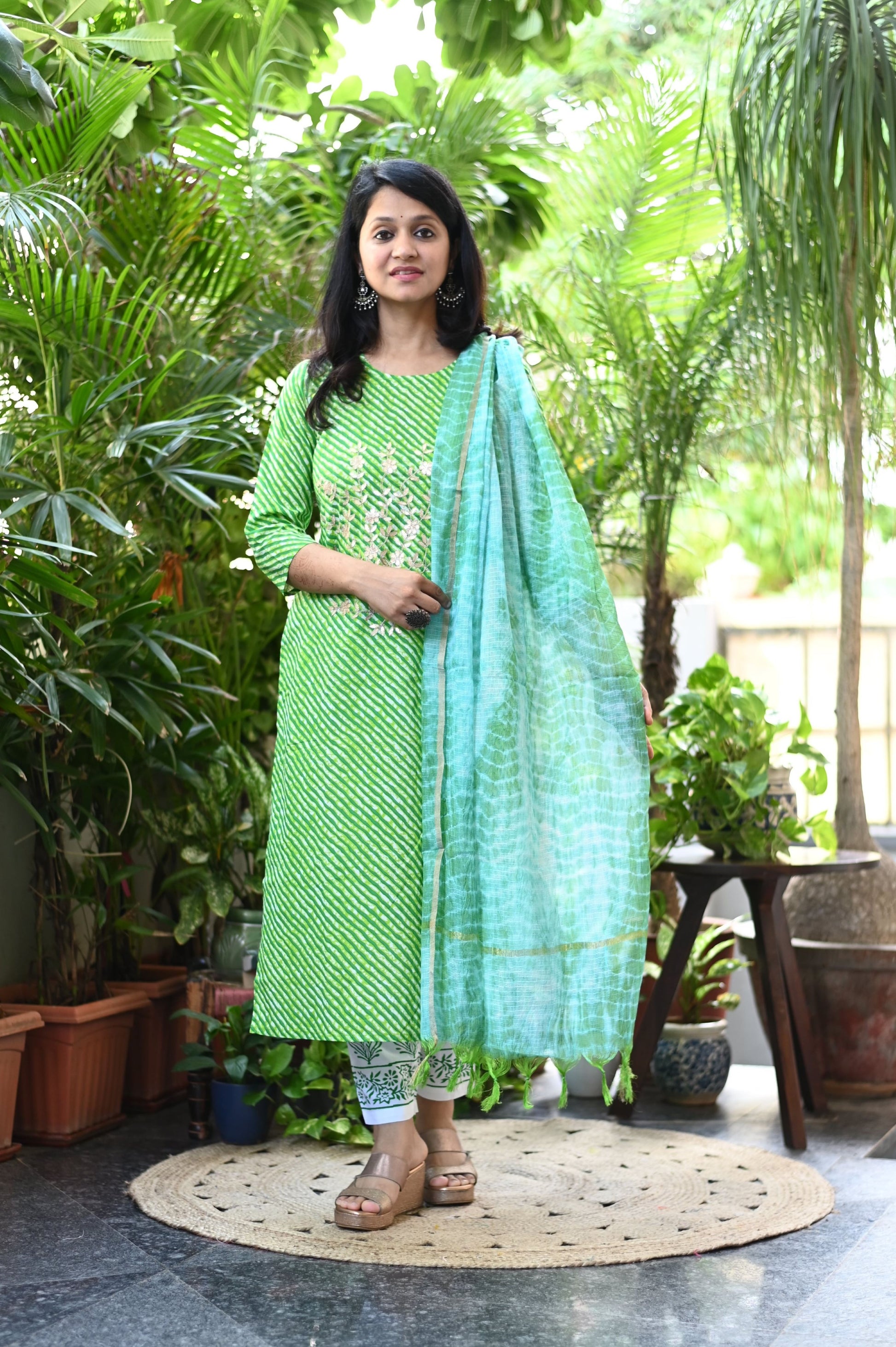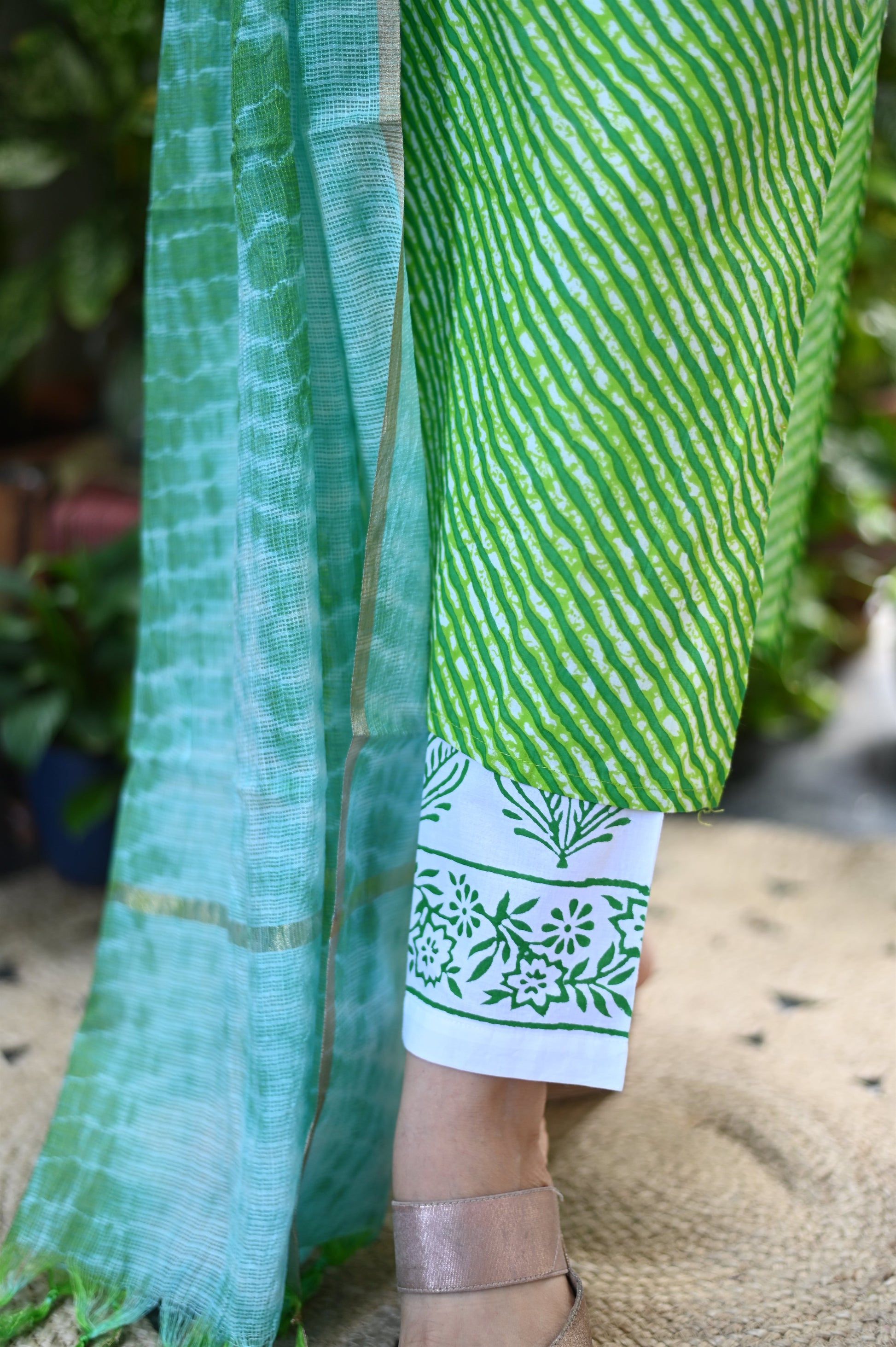 Elevate your wardrobe with our Red Lehariya Suit Set. Featuring stunning zari handwork on a Lehariya print Kurta, complete with matching Hand Block Print pants and a luxurious ombre pure Kota check Dupatta. Look and feel exclusive with this sophisticated and elegant ensemble.