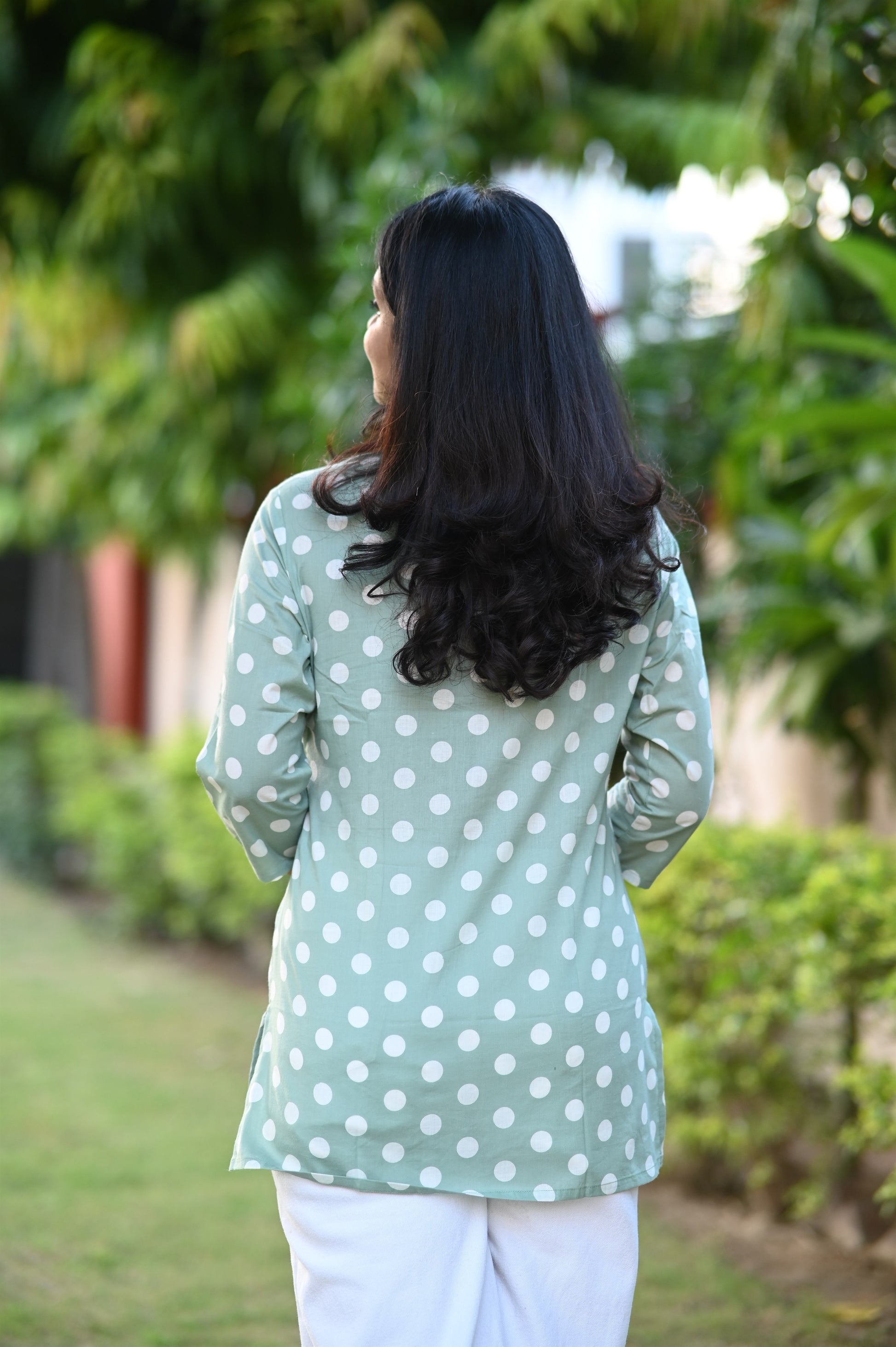 The dress in this picture is a light green kurta with a playful polka dot print. The polka dots are white and evenly spaced, adding a retro yet fresh vibe to the overall look. The kurta has a straight cut with three-quarter sleeves and features a round neckline with a small, buttoned placket. The buttons are wooden enhancing the natural, earthy feel of the outfit.