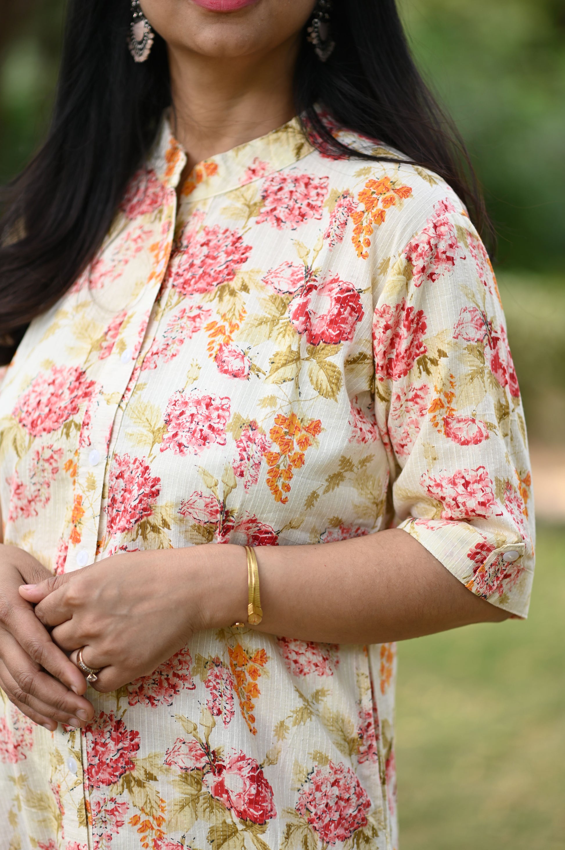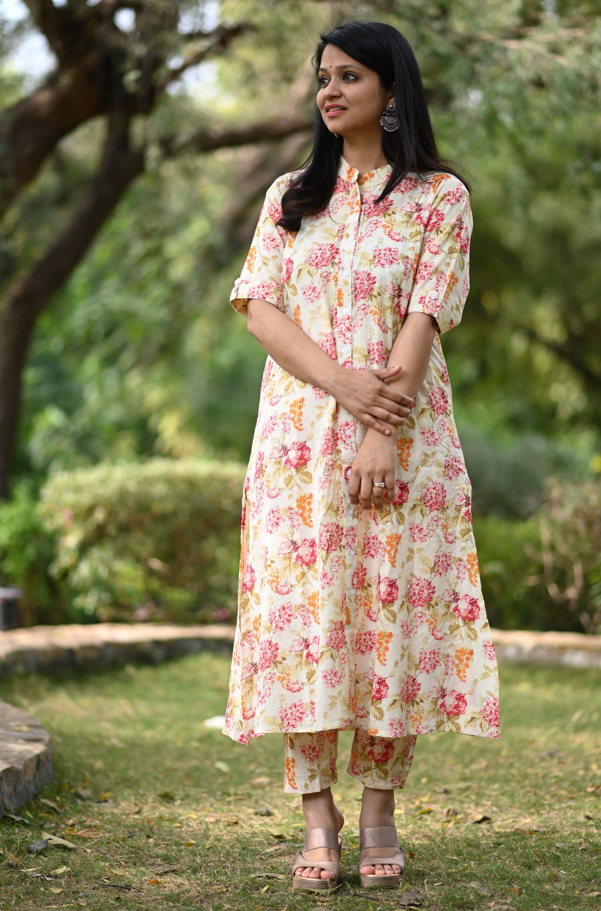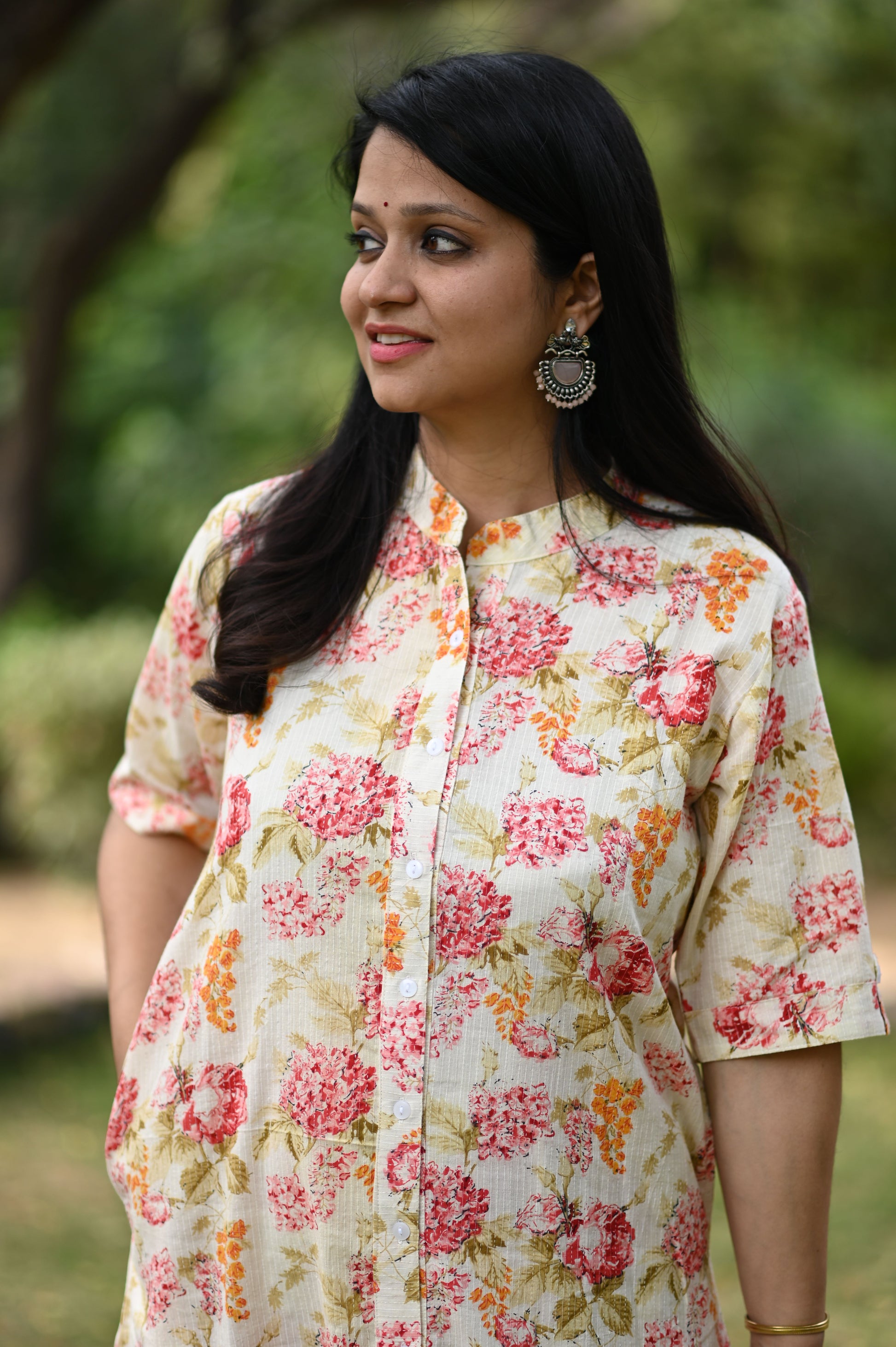 This set features a striking floral print in geometric shapes on a luxurious Katha cotton fabric, with openable buttons and 2 convenient pockets on both the top and bottom pieces. The top and bottom pieces are perfectly matched, with a Mandarin collar adding a touch of sophistication.