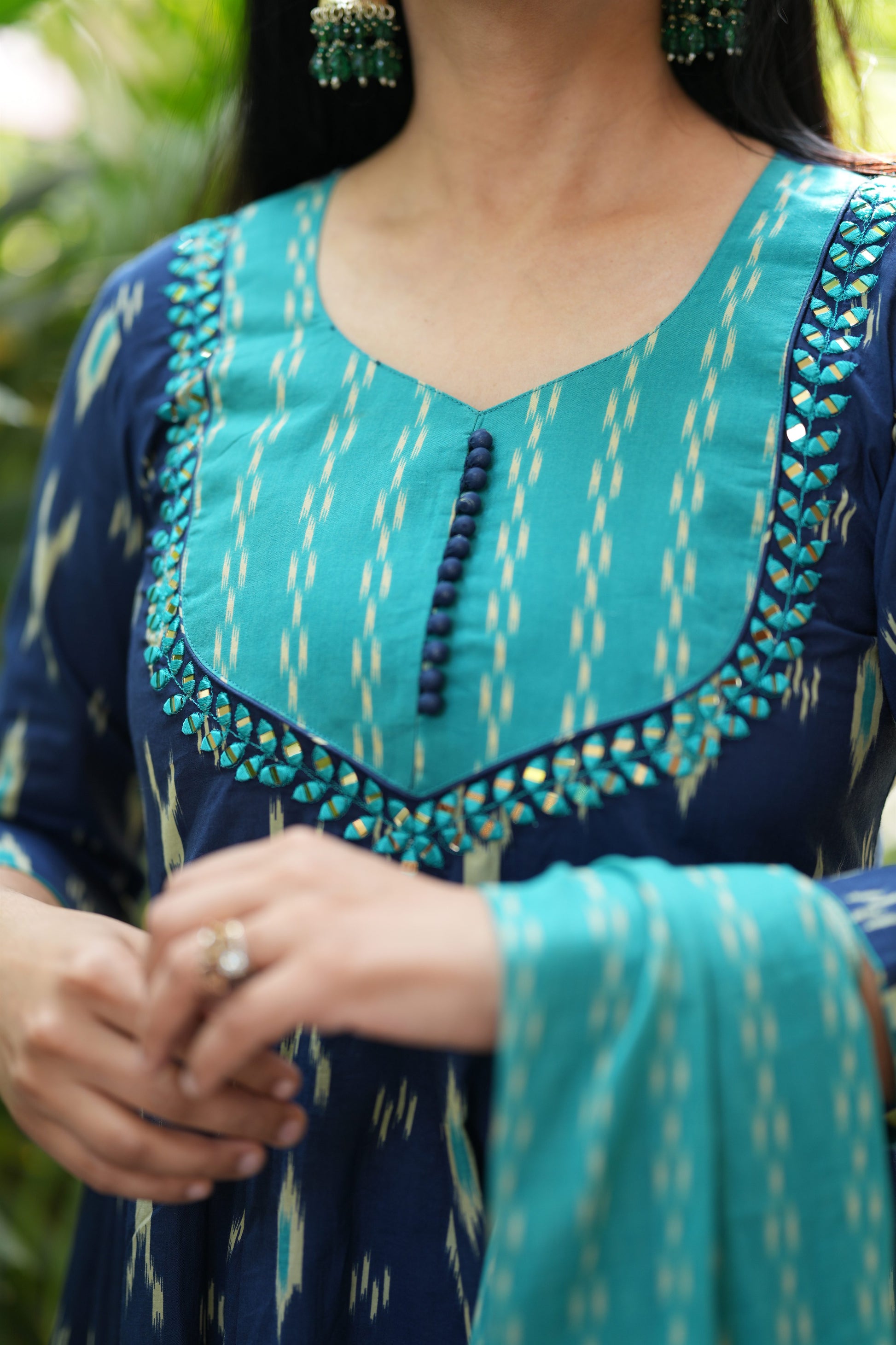 Crafted in soft 60×60 cotton, this Blue Ikat Anarkali suit set reflects timeless artisanal beauty. The kurta features traditional Ikat motifs enhanced with subtle thread mirror embroidery, adding handcrafted charm. Styled with printed straight pants and a matching dupatta, this three-piece ensemble is lightweight, breathable, and perfect for workdays, casual gatherings, and relaxed festive moments.