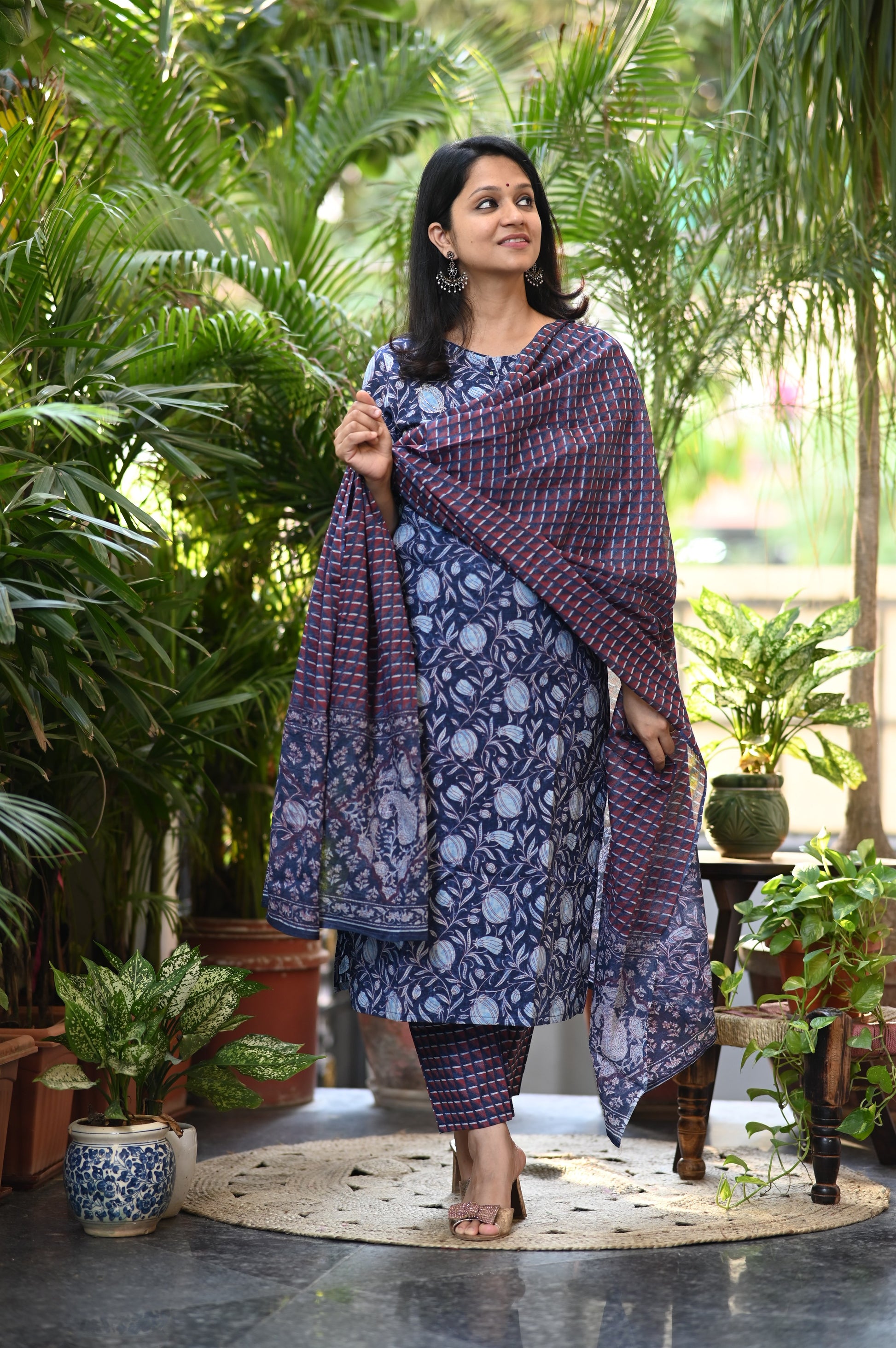 This Kaashmi Blue Cotton Suit Set features a stunning floral design in shades of blue, accented with intricate leaf and flower motifs. The geometric pattern on the salwar (pants) adds a touch of sophistication. The set is completed with a beautiful dupatta, making it a must-have for any wardrobe.