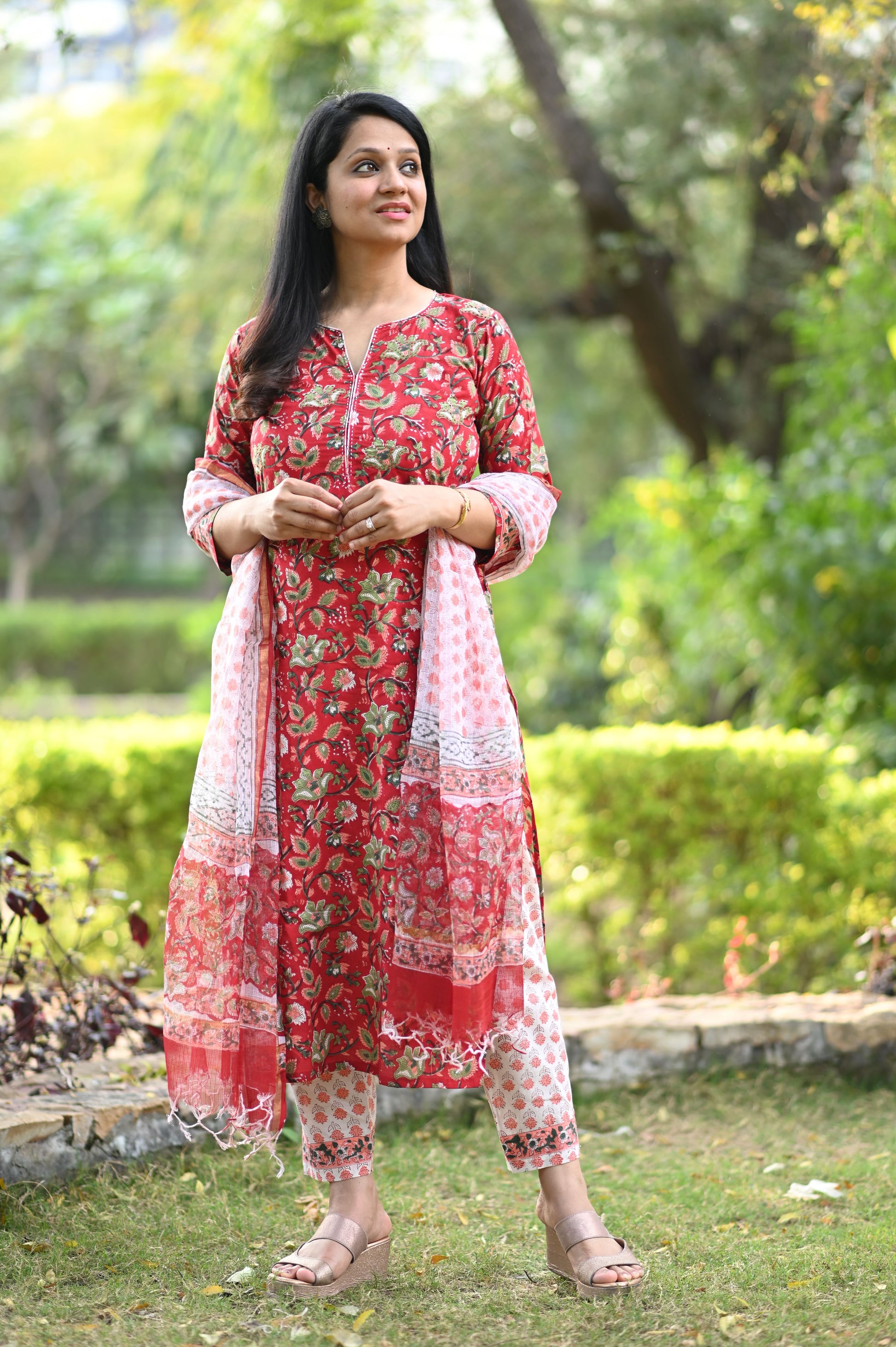 This Mallika Hand Block Cotton Suit Set features pure cotton floral printed fabric that has been dyed using natural vegetable dyes. The Katha hand embroidery adds a touch of artistry to this set, and it comes with a pure Kota Doria Dupatta for a complete and luxurious look.