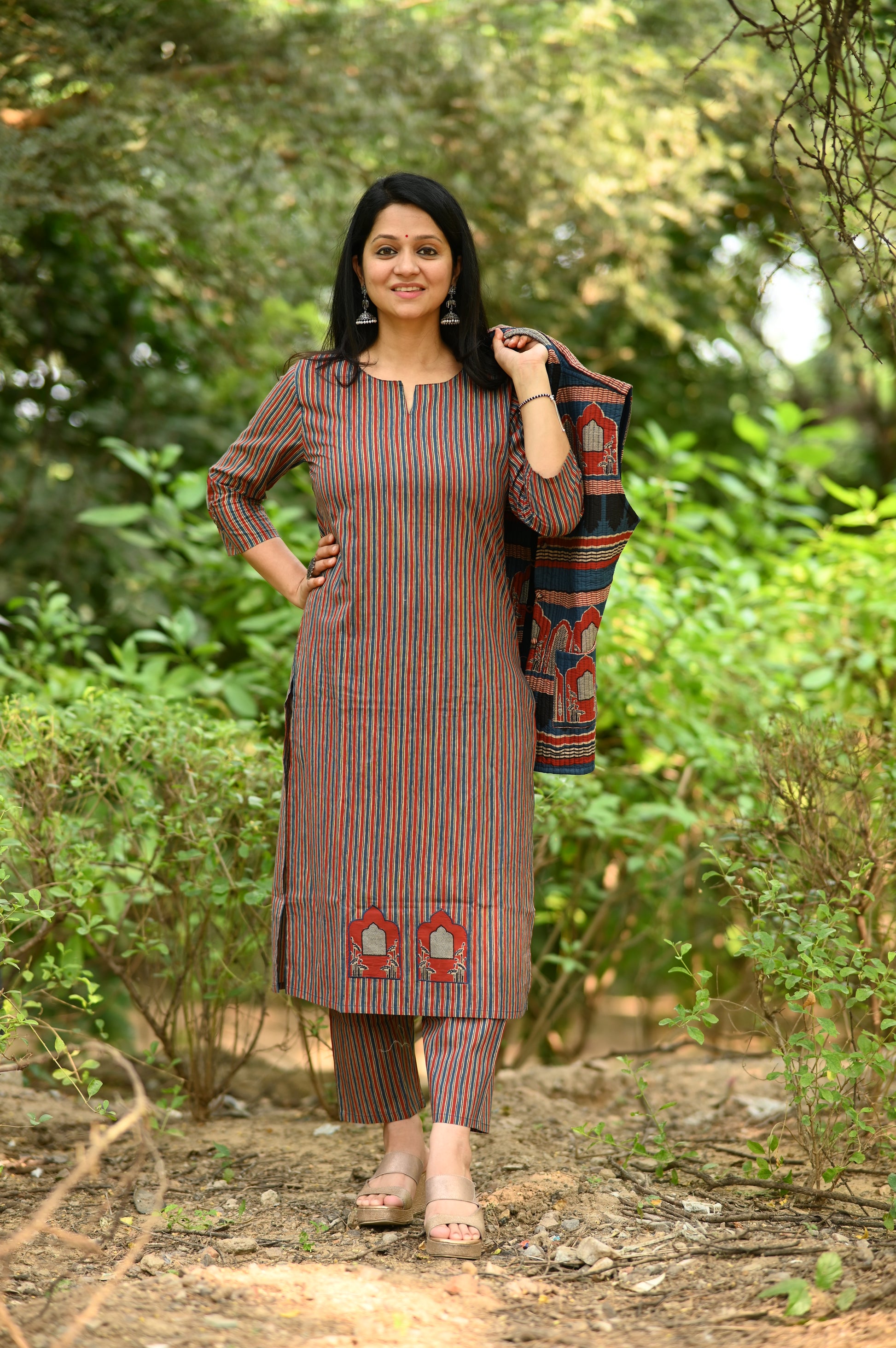 Natural-dyed colours might bleed during the first few washes or rub against the skin & other light-coloured garments. In the artful process of hand block-printing, embroidery work and stitching, variations are likely to come into existence. These irregularities are the hallmark of all handmade products and give each style a unique identity.