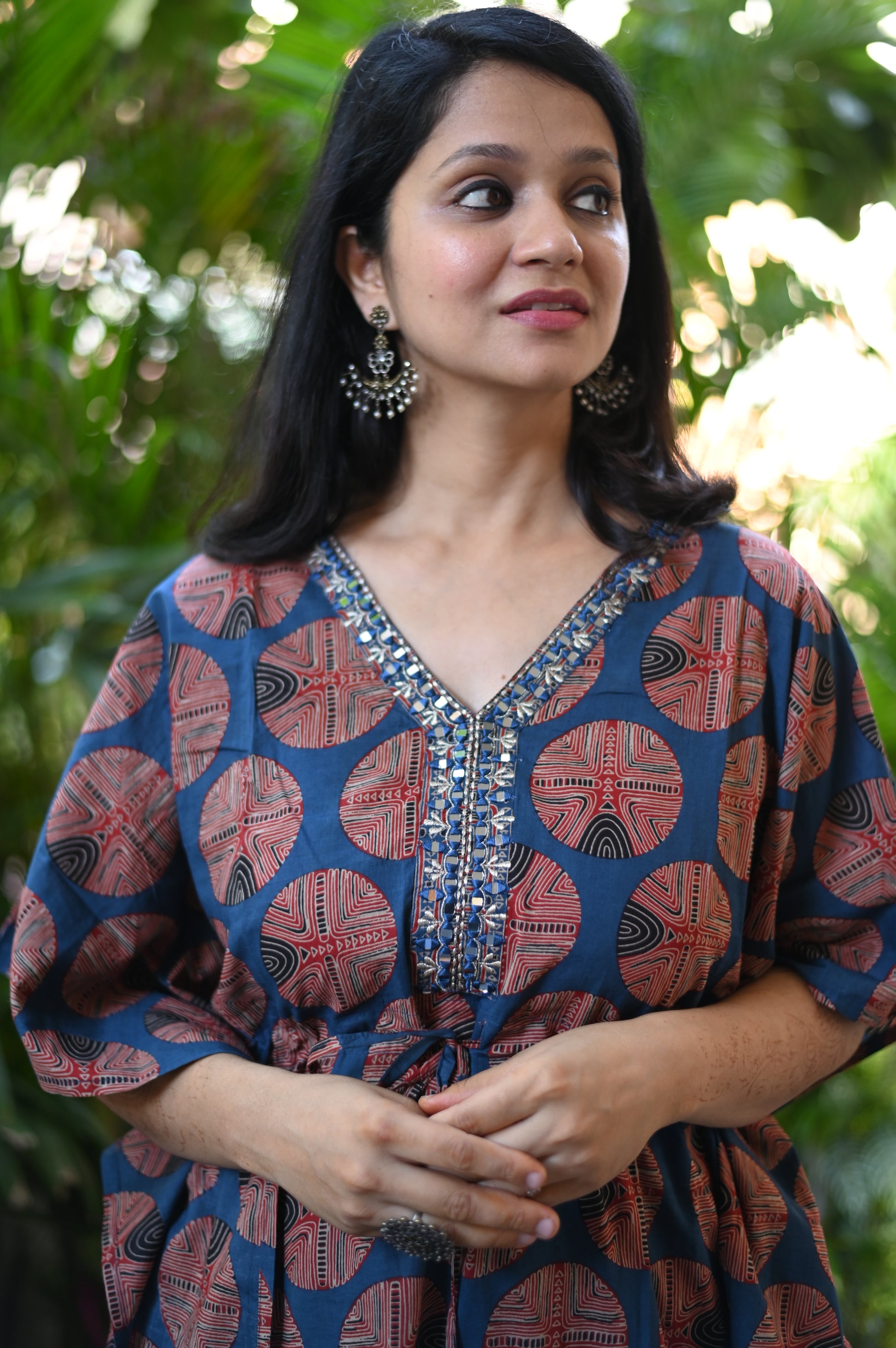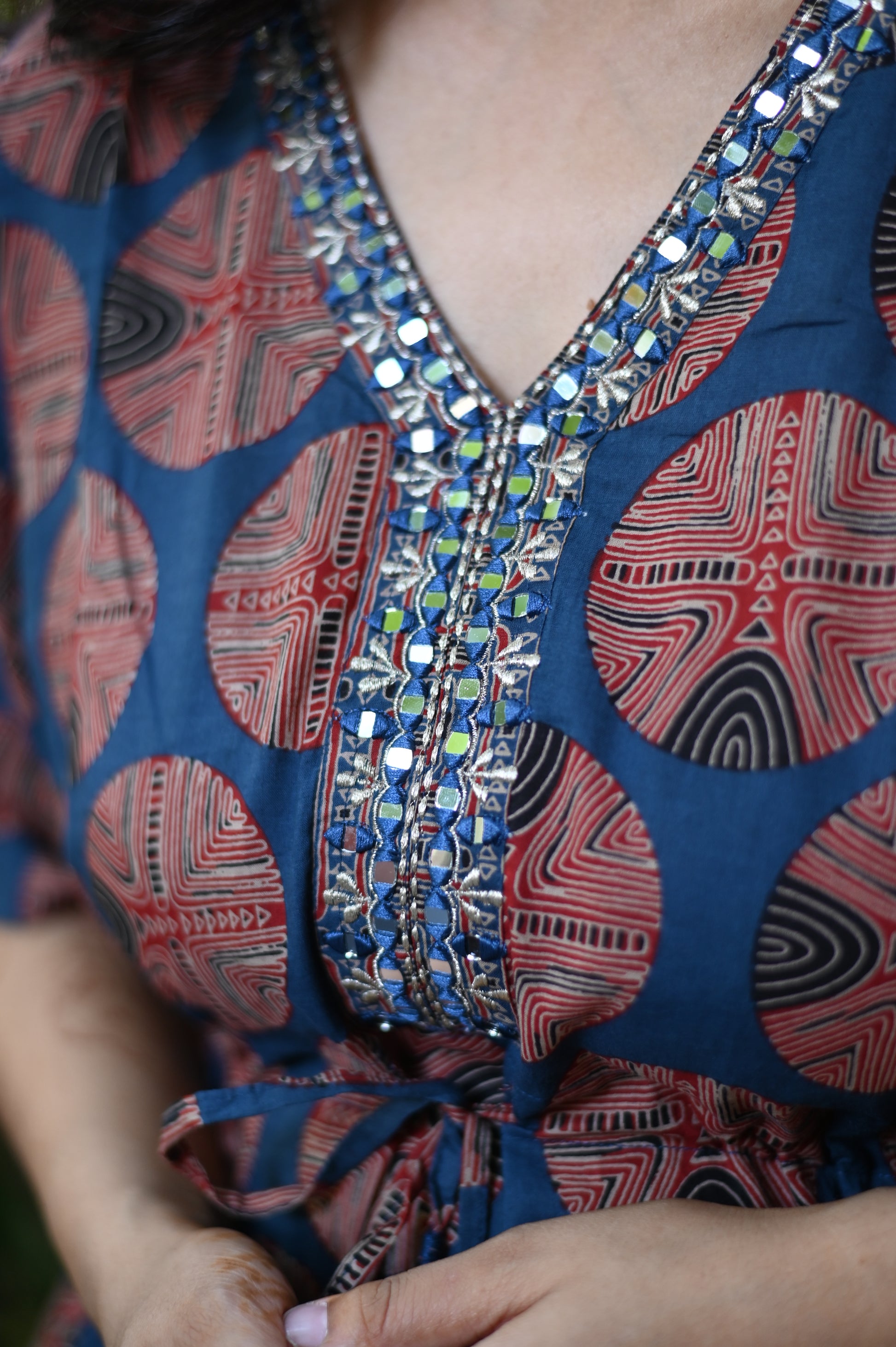 Natural-dyed colours might bleed during the first few washes or rub against the skin & other light-coloured garments. In the artful process of hand block-printing, embroidery work and stitching, variations are likely to come into existence. These irregularities are the hallmark of all handmade products and give each style a unique identity.