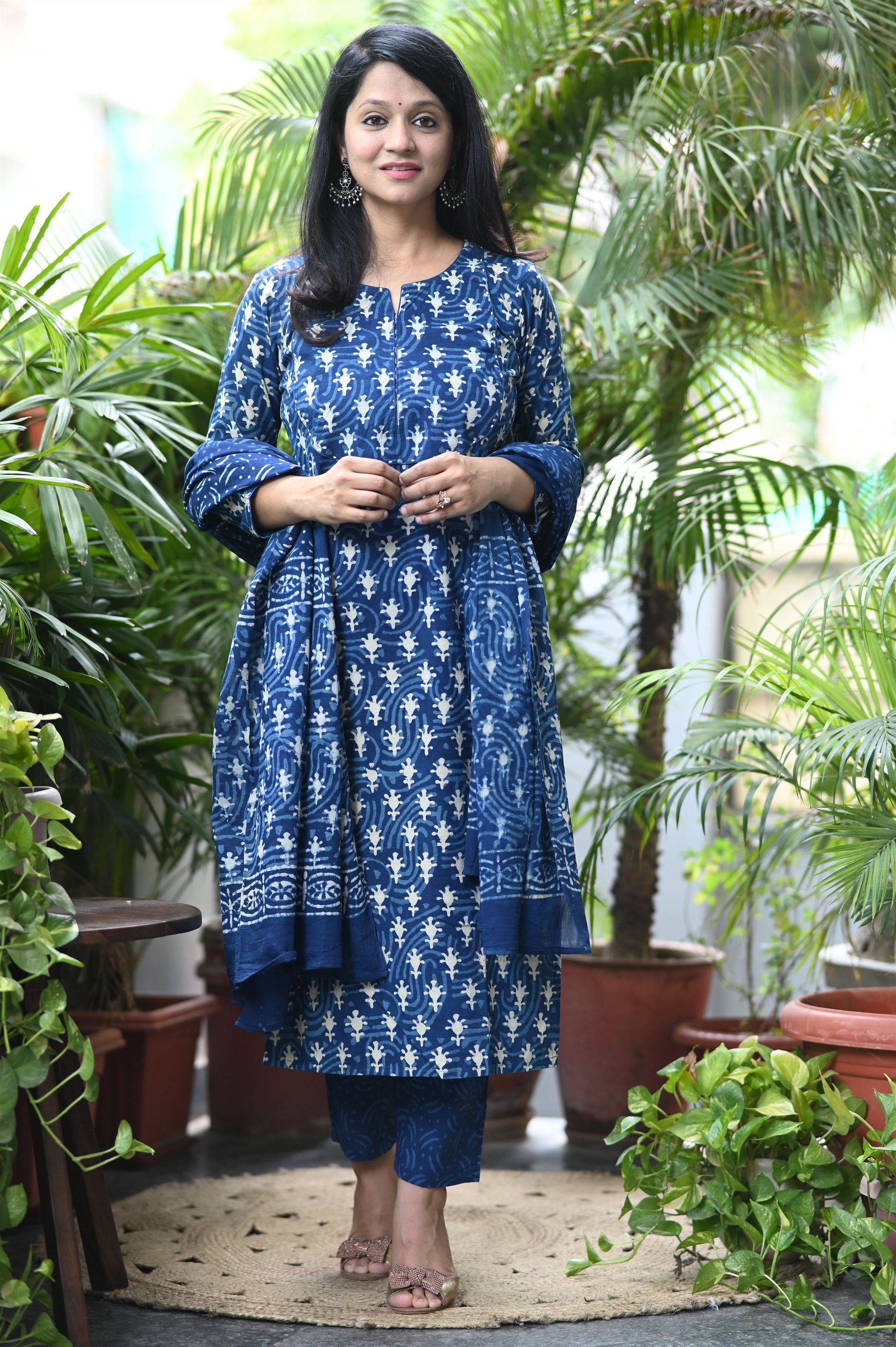 This elegant suit set features a kurta with delicate white hand-block prints on a deep indigo base, paired with matching straight-fit pants. A printed cotton dupatta with bold motifs and a detailed border completes the look. Made from soft, breathable cotton, it’s perfect for comfortable, stylish wear.