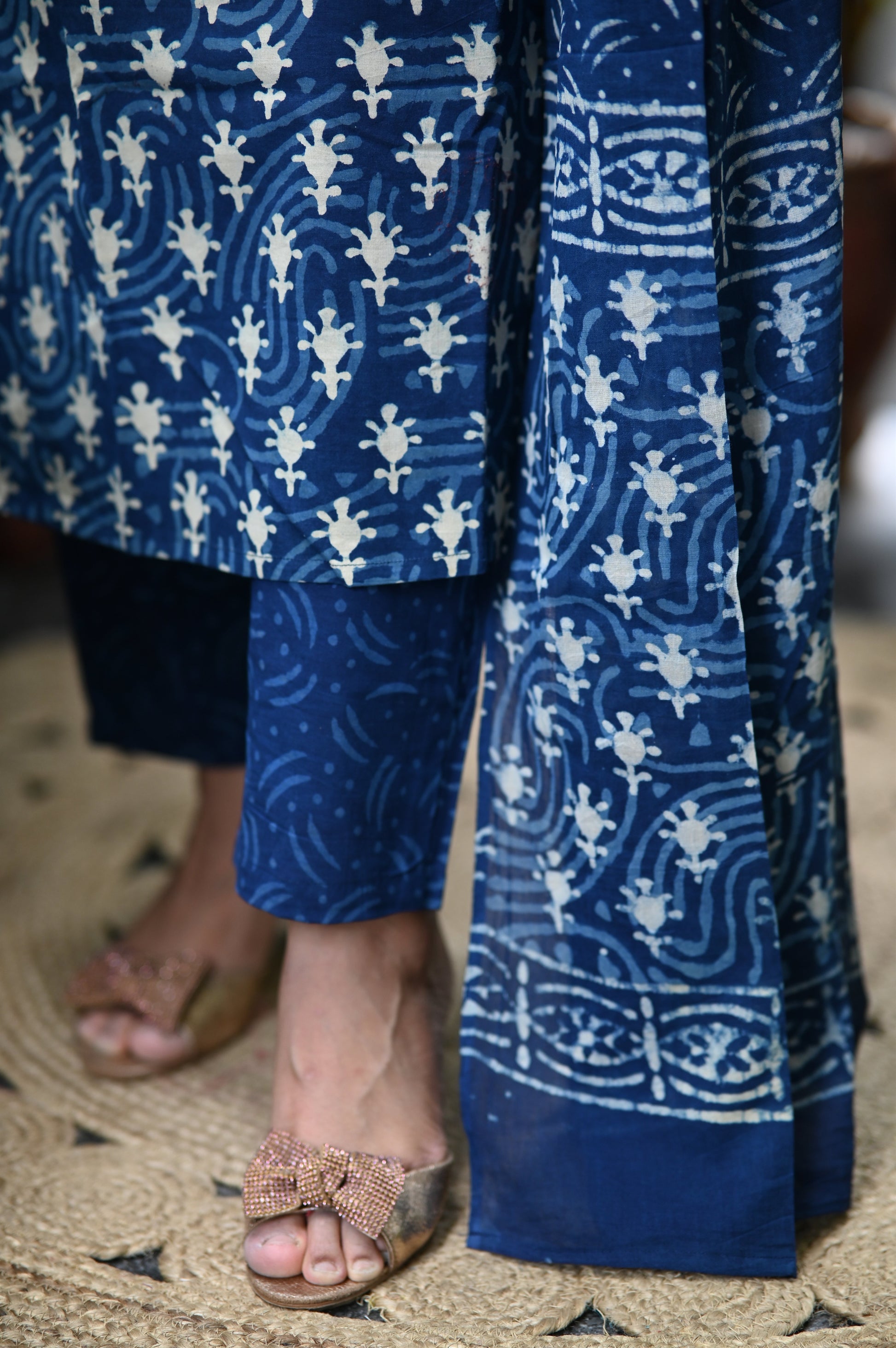 Natural-dyed colours might bleed during the first few washes or rub against the skin & other light-coloured garments. In the artful process of hand block-printing, embroidery work and stitching, variations are likely to come into existence. These irregularities are the hallmark of all handmade products and give each style a unique identity.