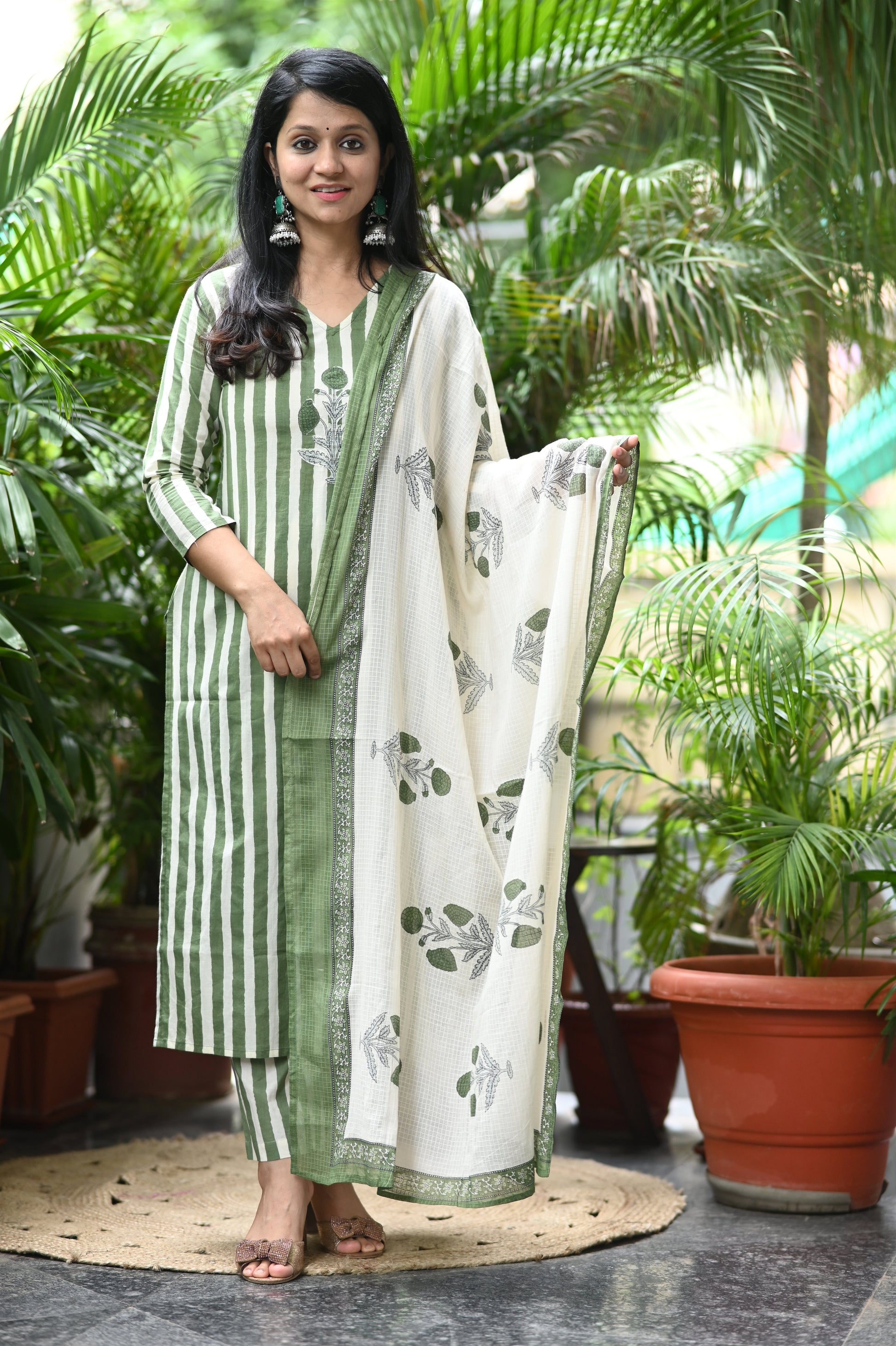 A blend of simplicity and elegance, this kurta pant set is designed in soft cotton with subtle olive stripes, making it perfect for both office and casual wear. The yoke is adorned with delicate applique work that adds a graceful touch to the minimal design. Paired with matching pants and a pure handblock Kota Doria dupatta featuring intricate motifs, the ensemble beautifully balances everyday comfort with timeless charm. Whether styled for work, a casual outing, or a semi-formal gathering, this set brings effortless sophistication to your wardrobe.