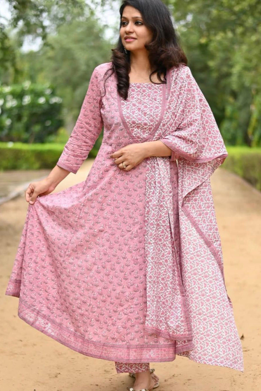 Crafted in soft cotton, this onion pink Anarkali is adorned with intricate handblock motifs and highlighted with delicate silver khadi printing that lends it a festive shimmer. The flowing flare adds elegance while ensuring comfort, making it ideal for long hours of wear. Paired with matching pants and a lightweight stole dupatta, this set strikes the perfect balance between traditional charm and modern ease, making it a graceful choice for casual gatherings, festive occasions, or everyday elegance.