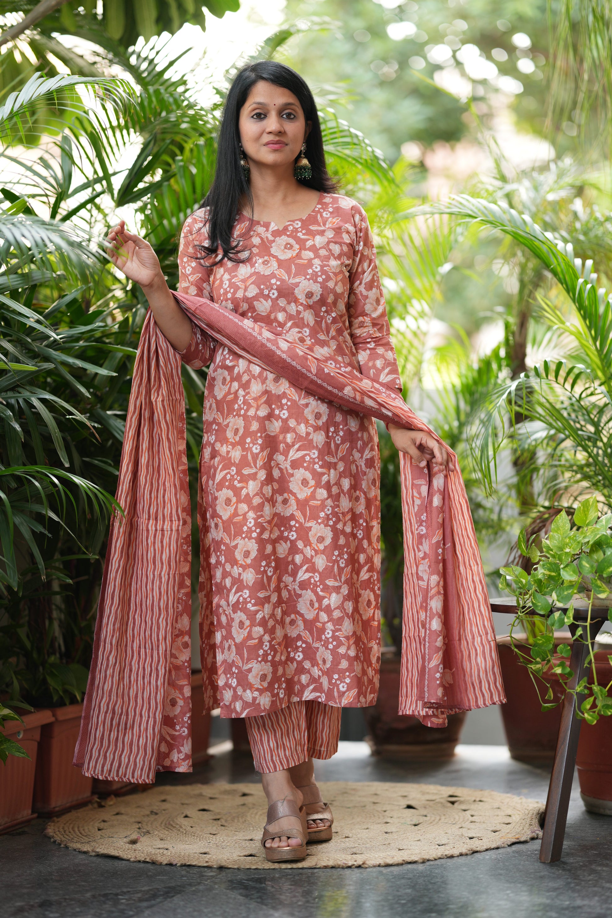 This Orange Floral Print Cotton Suit Set brings together vibrant style and everyday wearability. Crafted from soft, breathable pure cotton, it showcases beautiful floral designs adorned with fine katha embroidery and delicate sequin details.