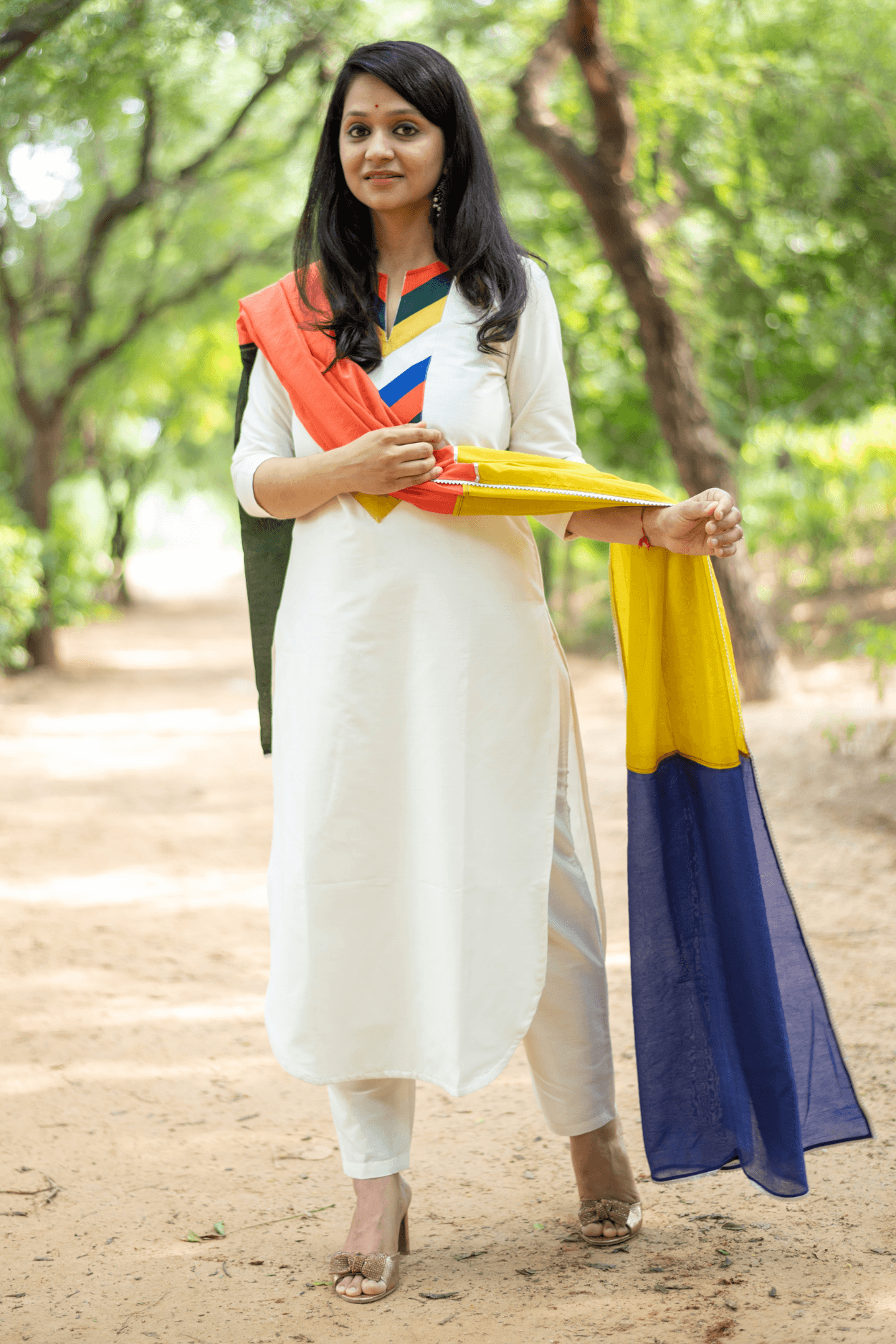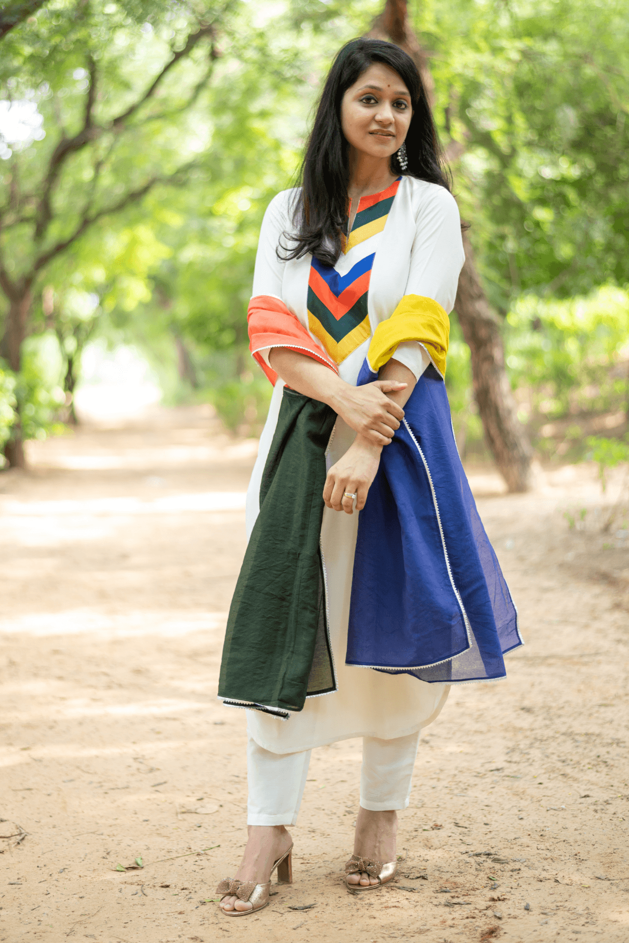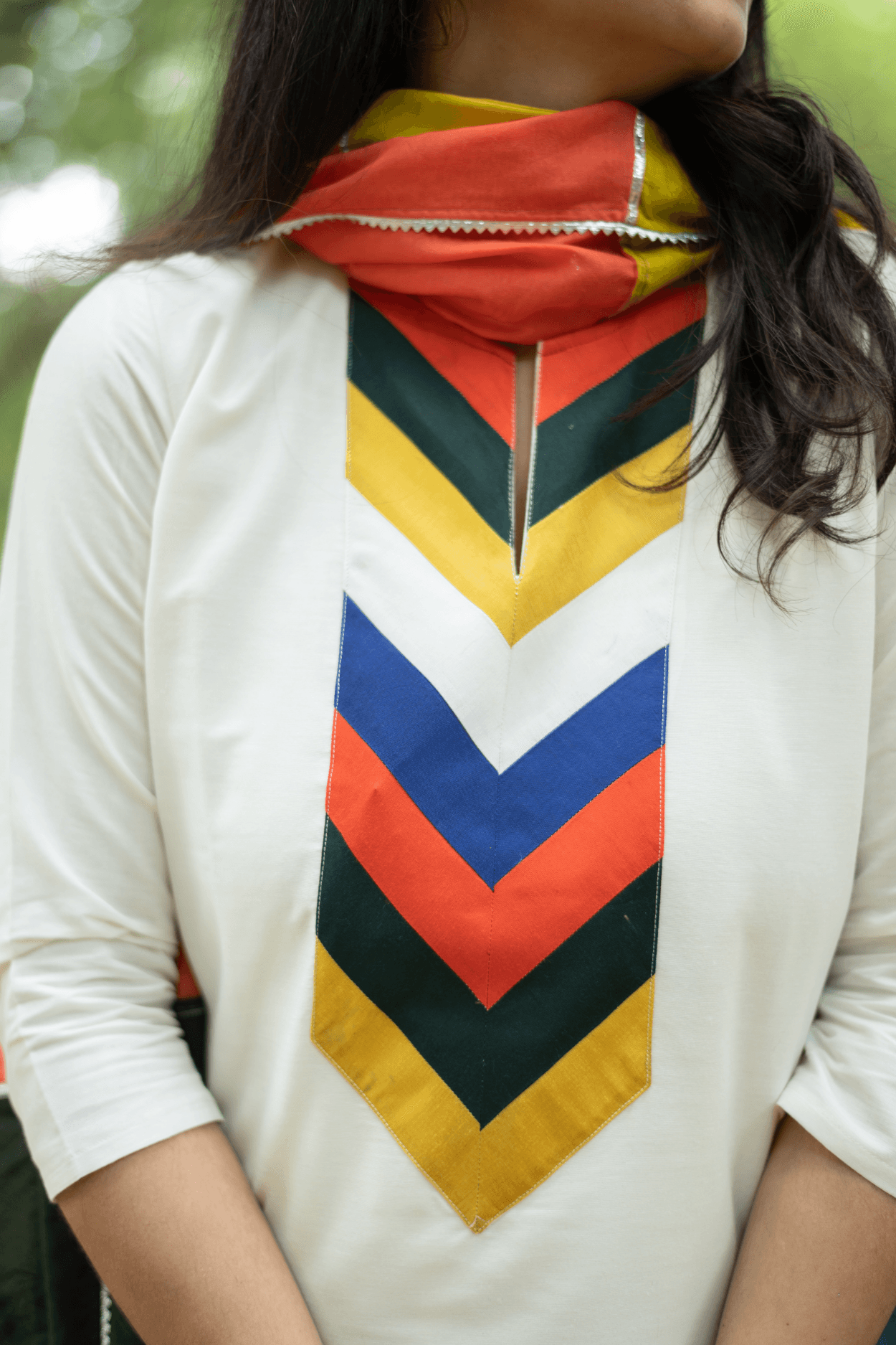 Natural-dyed colours might bleed during the first few washes or rub against the skin & other light-coloured garments. In the artful process of hand block-printing, embroidery work and stitching, variations are likely to come into existence. These irregularities are the hallmark of all handmade products and give each style a unique identity.
