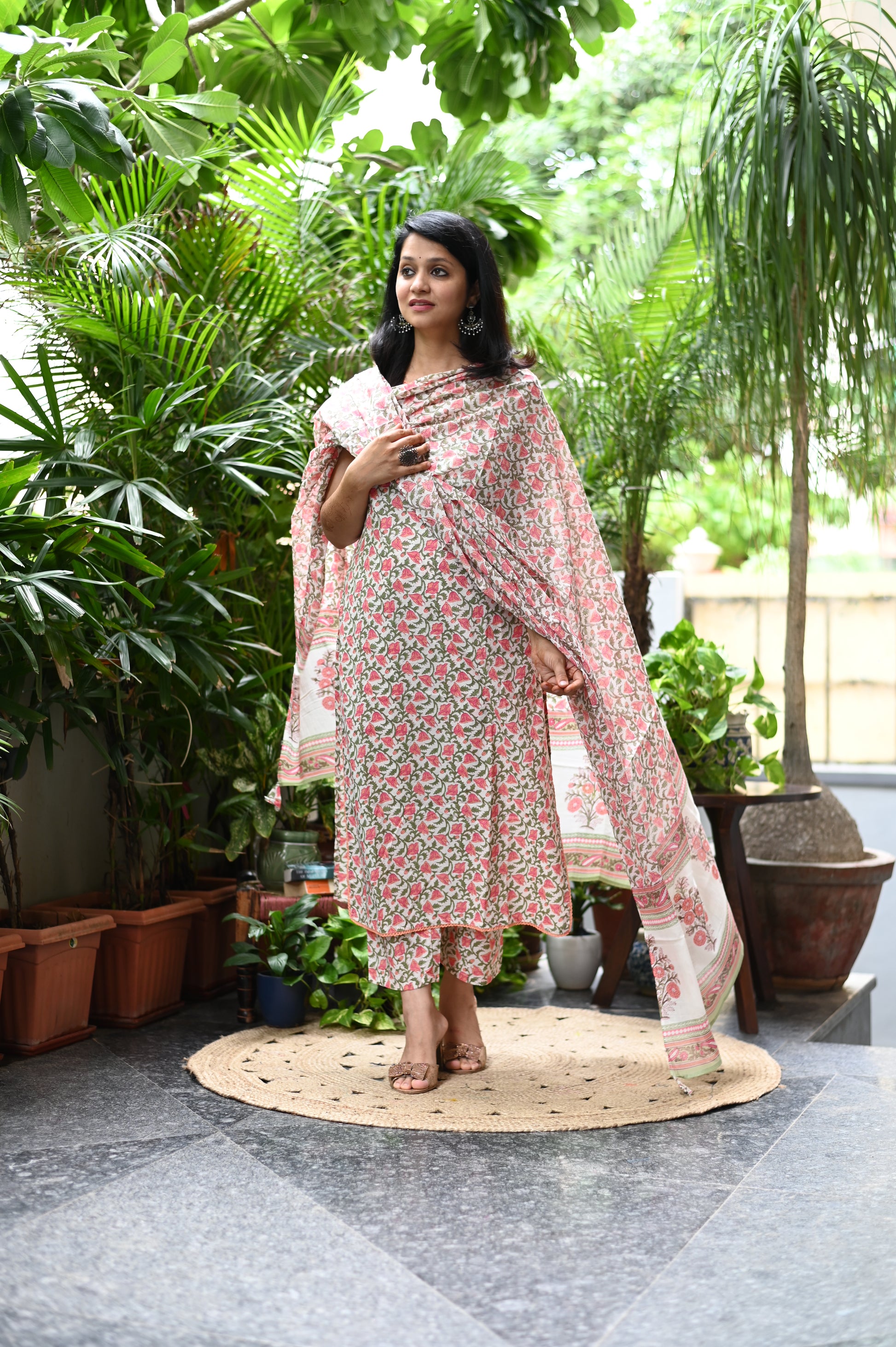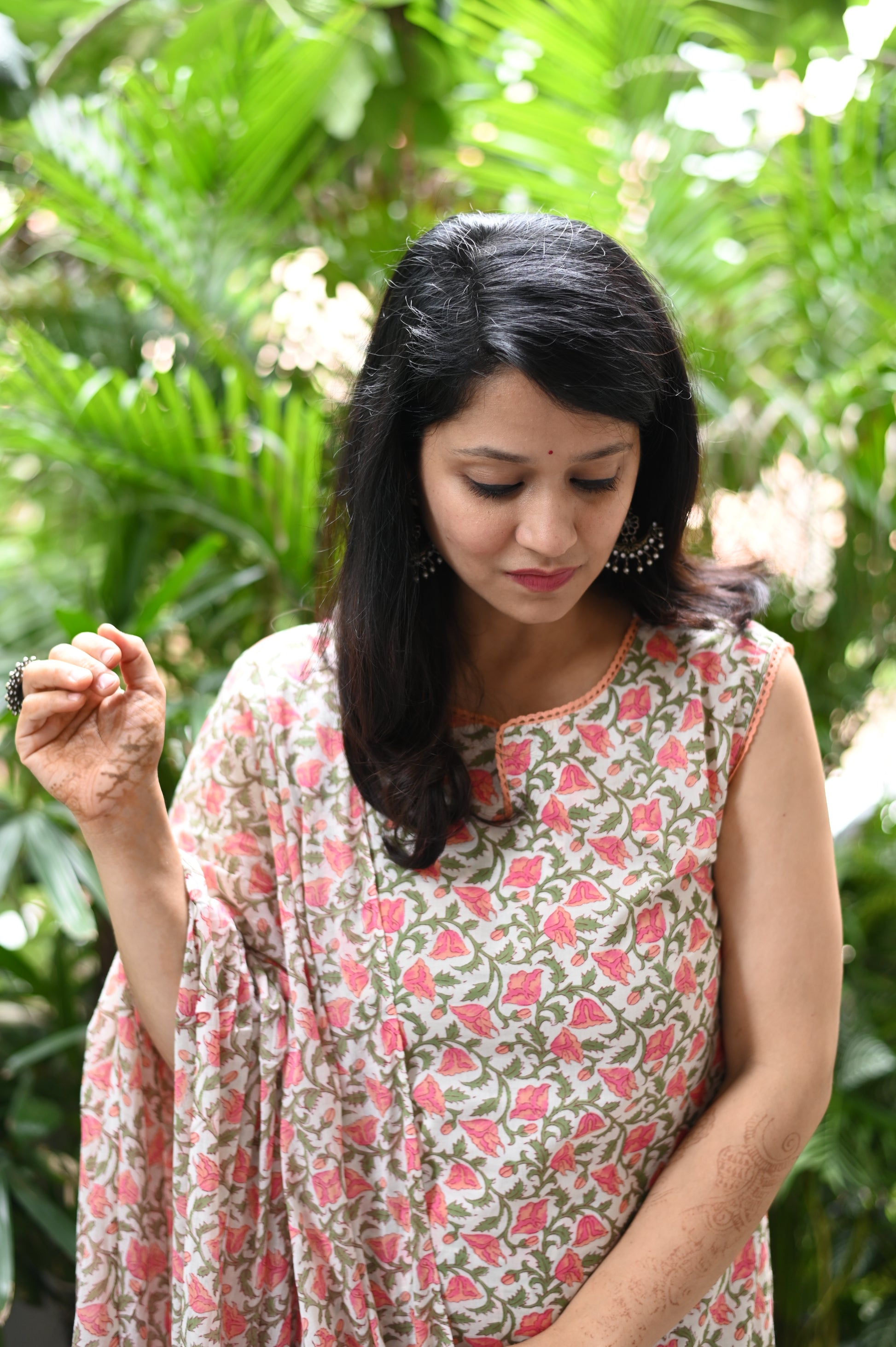 Sleevless Handblock Cotton Suit Set, meticulously crafted from 100% pure cotton for unparalleled comfort and breathability, featuring a stunning handblock print design.
