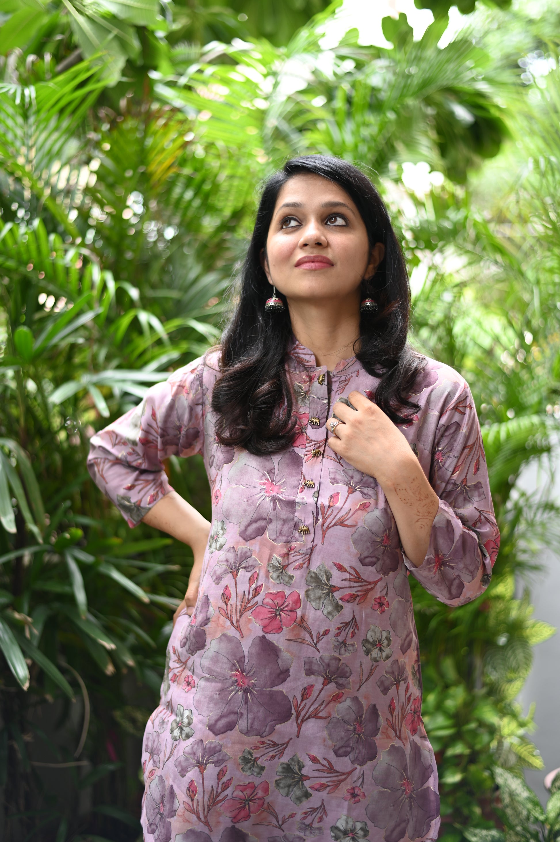 This stunning ensemble showcases a blue-based floral print co-ord set with a chic tunic-style kurta. The figure-flattering silhouette is enhanced with three-quarter sleeves and a strikingly intricate floral design in a pastel colours. The coordinated pants feature a sleek, straight cut and carry the same bold floral motif, completing the cohesive and eye-catching look.