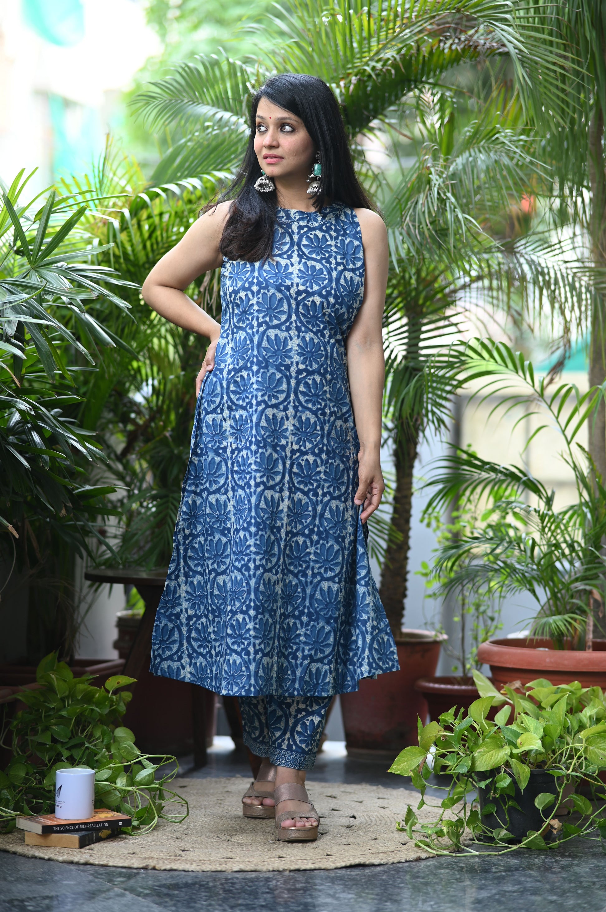 The Saira Cotton Kurta Pant Set combines understated elegance with striking design elements. This sleeveless indigo A-line kurta showcases distinctive linear and floral prints. Crafted from breathable cotton, it offers comfort alongside a contemporary artistic flair. Perfect for a refined everyday look or a subtle ethnic statement, this ensemble embodies effortless style and grace.