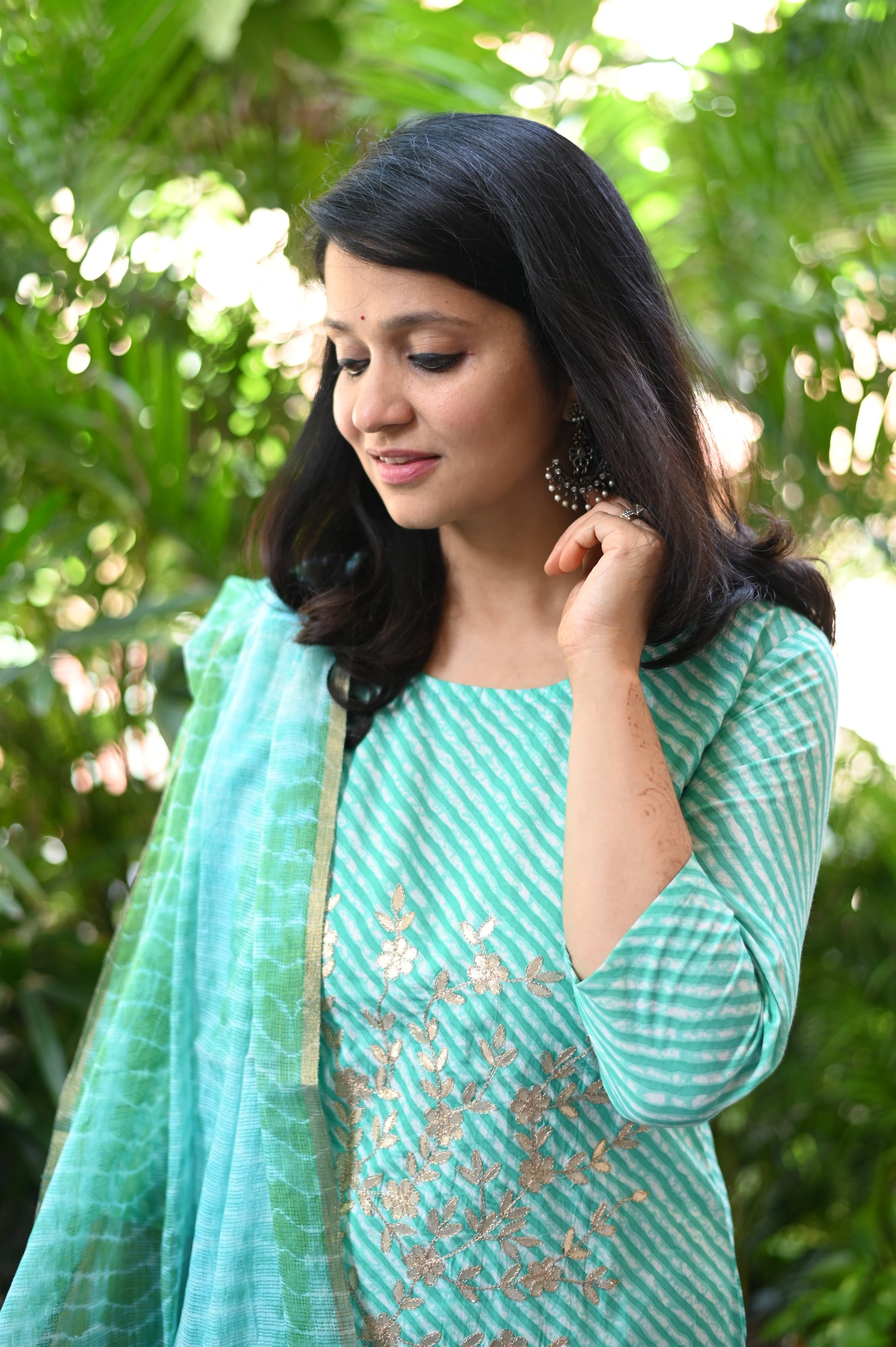 Elevate your wardrobe with our Red Lehariya Suit Set. Featuring stunning zari handwork on a Lehariya print Kurta, complete with matching Hand Block Print pants and a luxurious ombre pure Kota check Dupatta. Look and feel exclusive with this sophisticated and elegant ensemble.