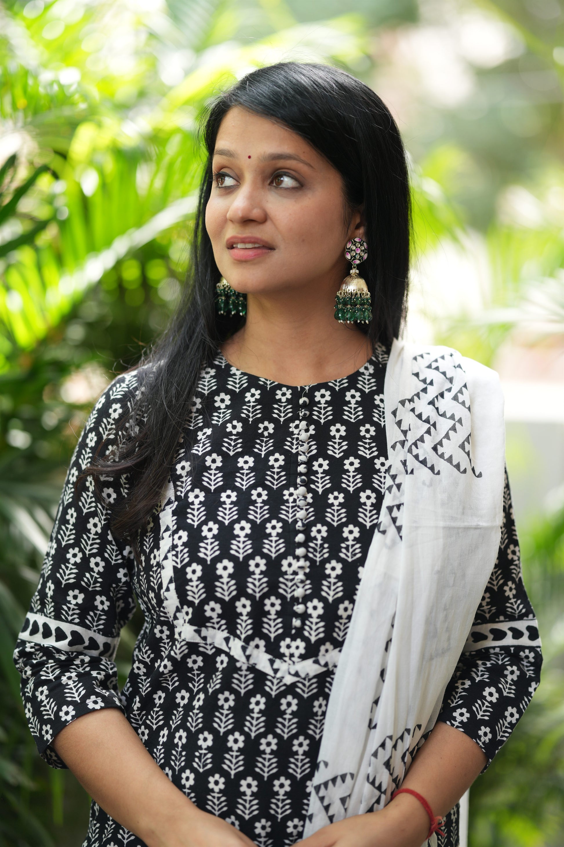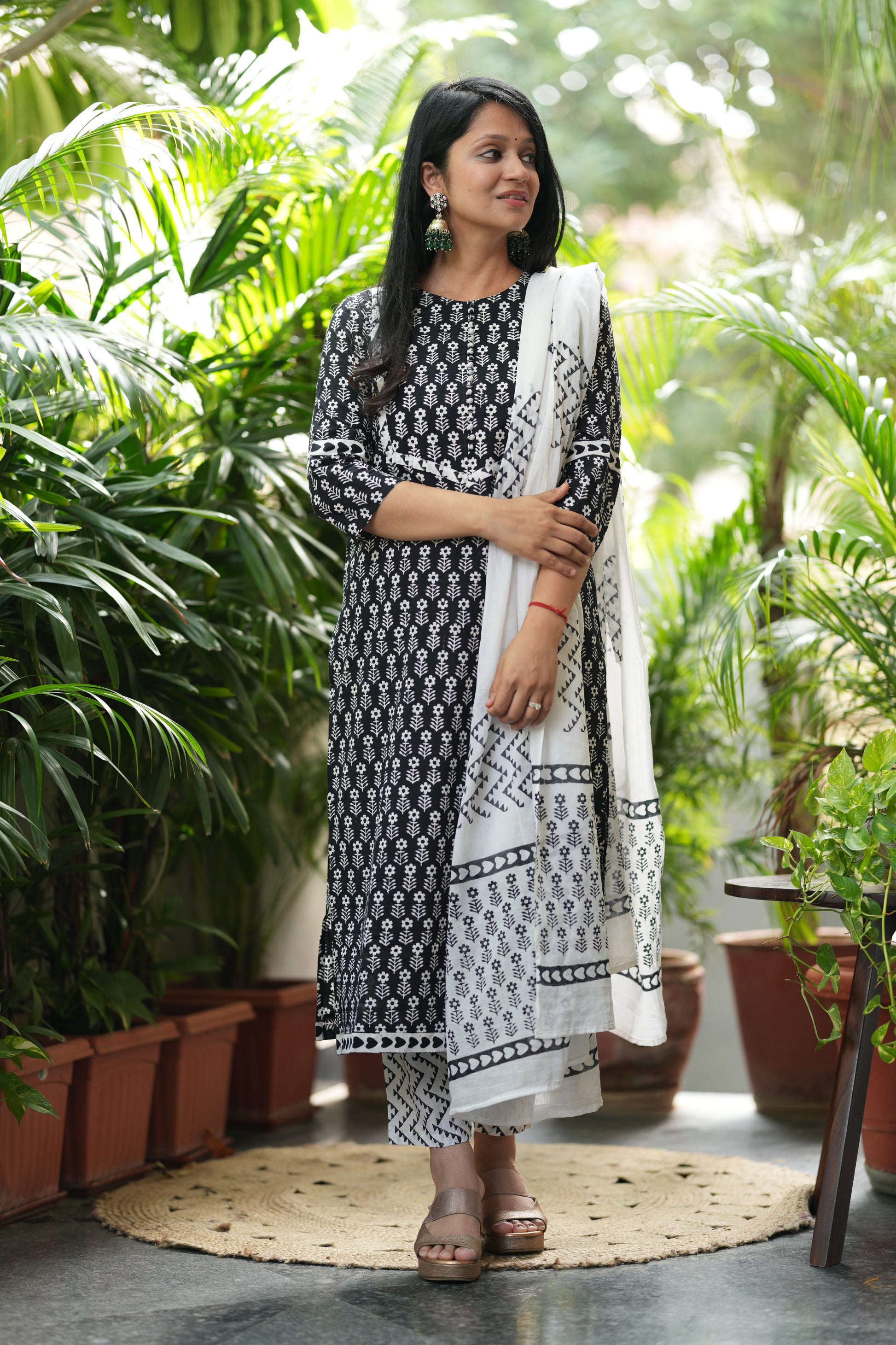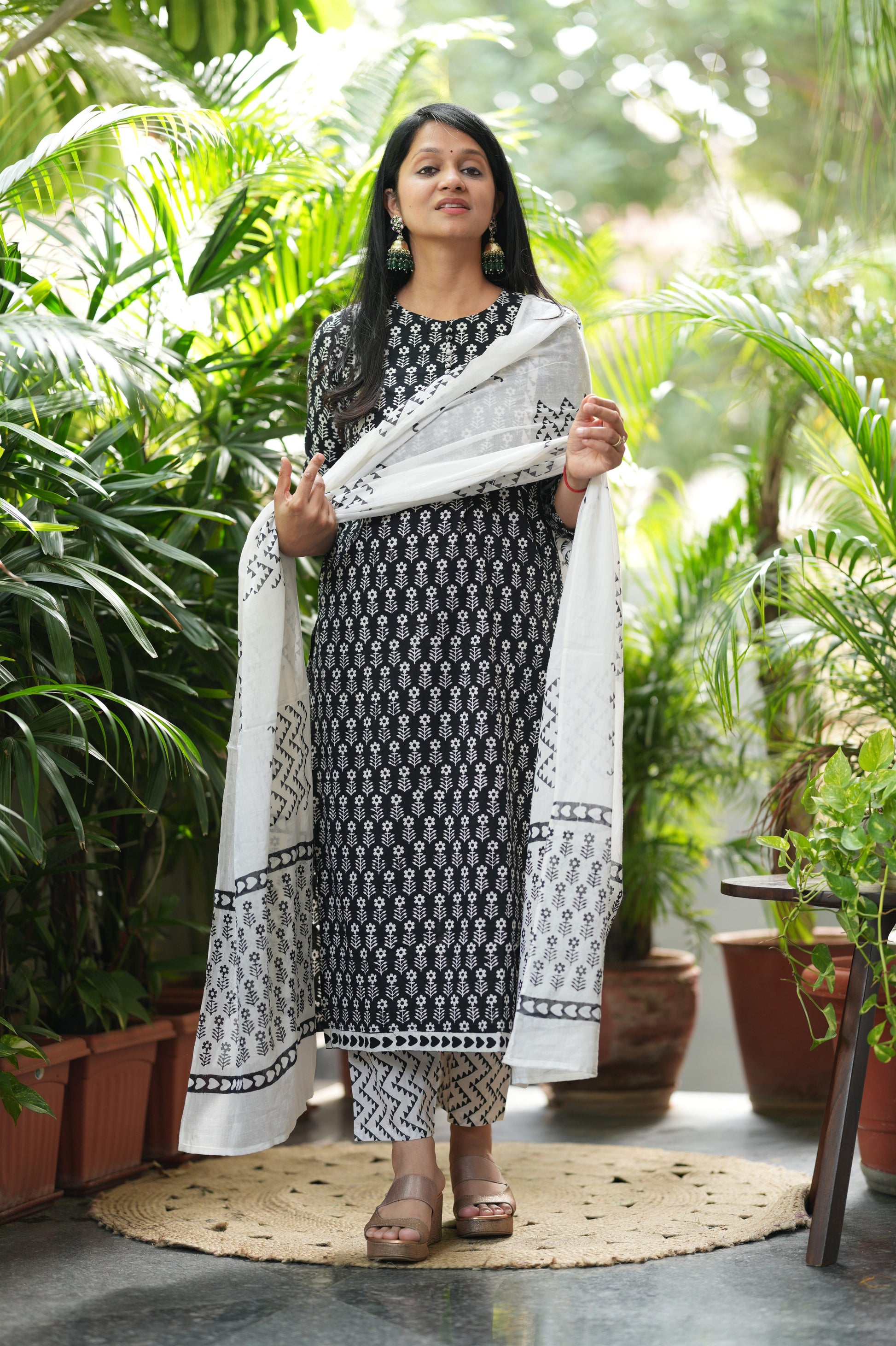 This 3-piece ensemble includes a kurta, pant, and dupatta crafted from pure cotton, ensuring breathability and comfort. The kurta features an authentic Bagru handblock print, accented with pom pom details on the yoke. The contrasting white cotton dupatta showcases elegant geometric and floral patterns. Designed for ease, the pantoffers a comfortable fit with convenient side pocket. Each piece is meticulously handcrafted in Jaipur, Rajasthan, reflecting traditional artistry and quality.