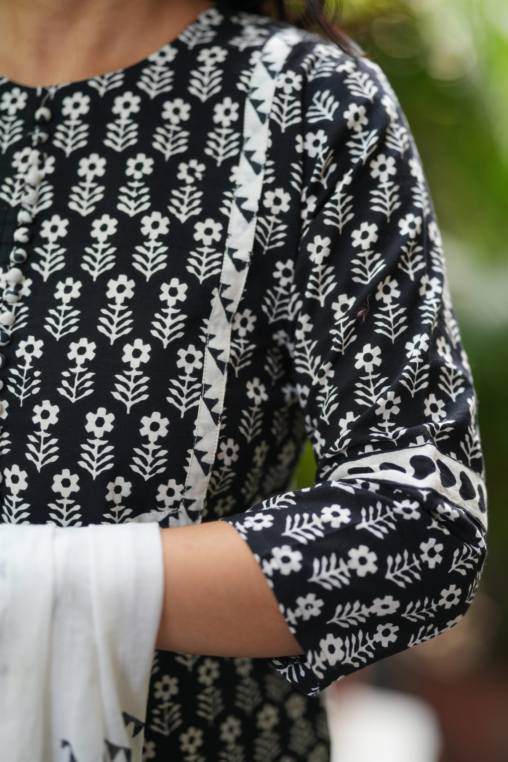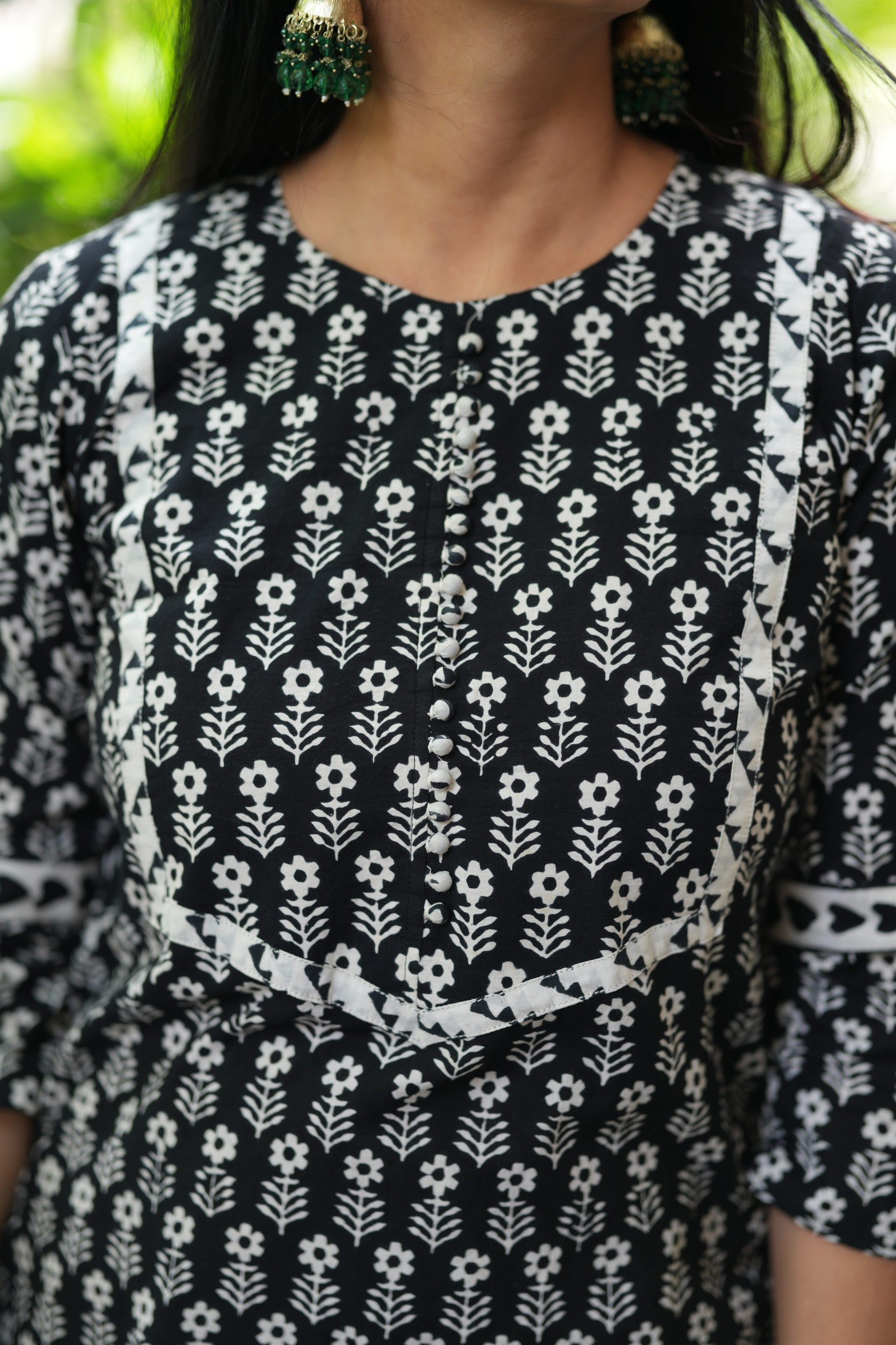 Natural-dyed colours might bleed during the first few washes or rub against the skin & other light-coloured garments. In the artful process of hand block-printing, embroidery work and stitching, variations are likely to come into existence. These irregularities are the hallmark of all handmade products and give each style a unique identity.