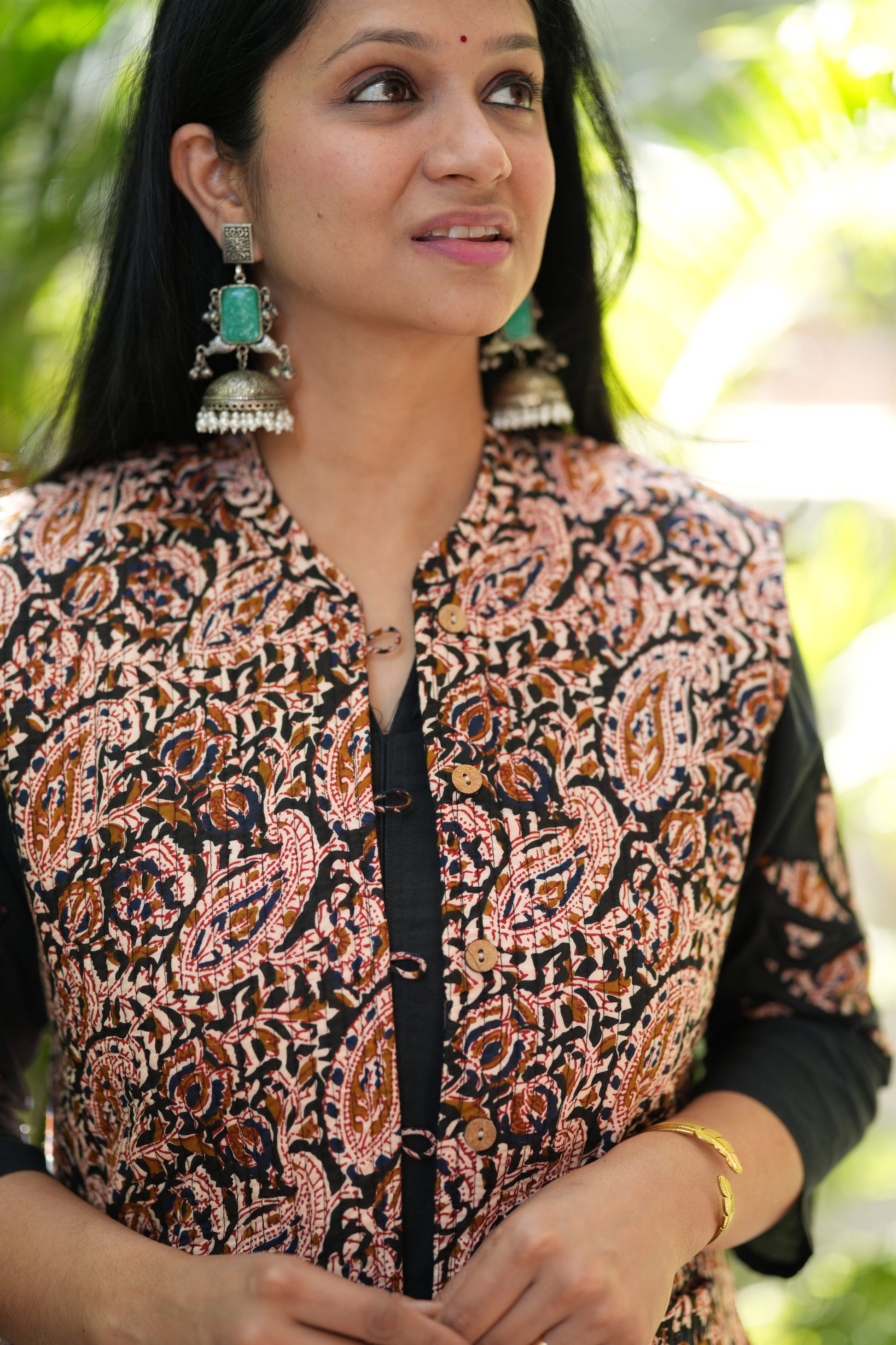 Natural-dyed colours might bleed during the first few washes or rub against the skin & other light-coloured garments. In the artful process of hand block-printing, embroidery work and stitching, variations are likely to come into existence. These irregularities are the hallmark of all handmade products and give each style a unique identity.