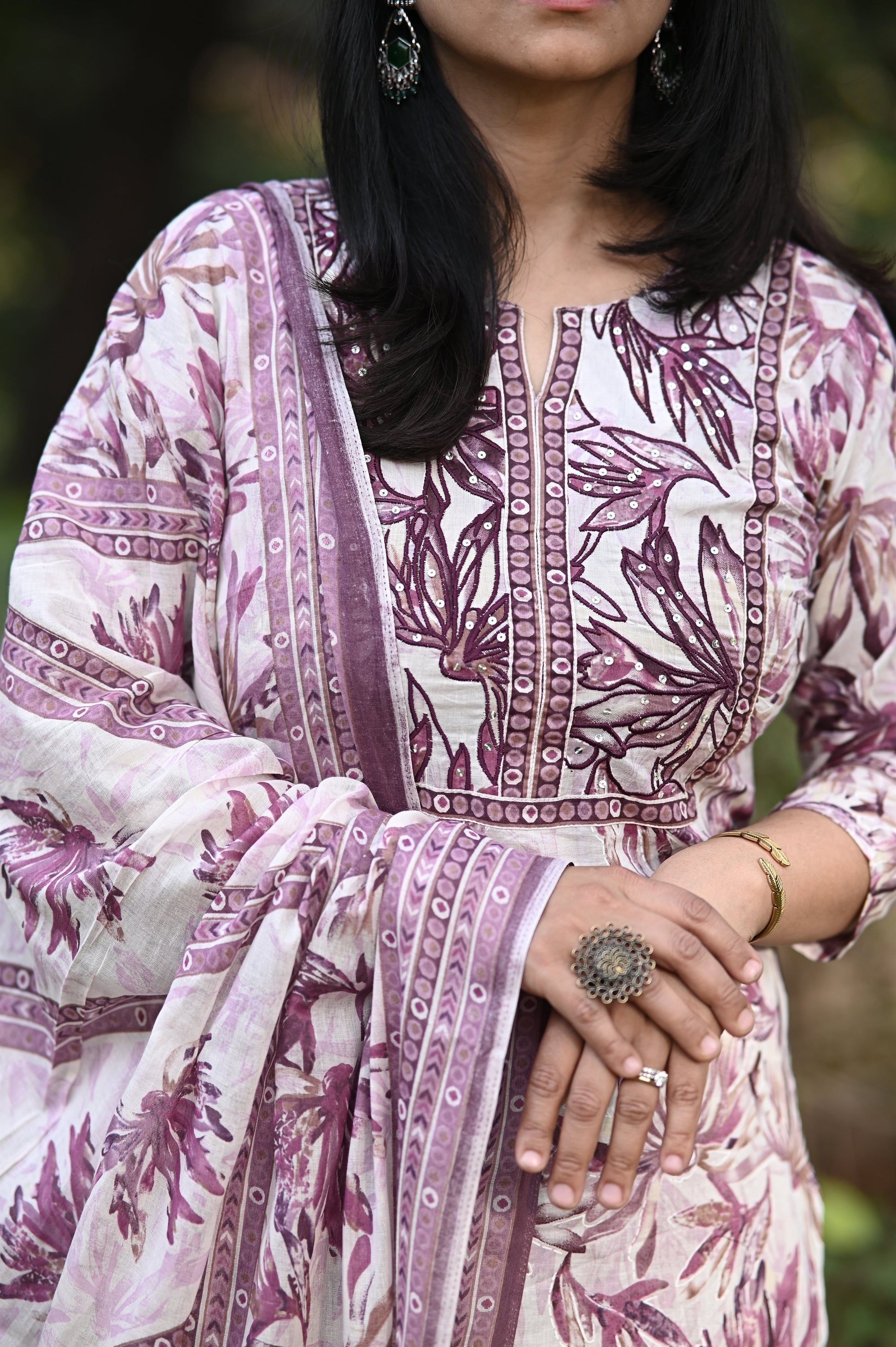 This cotton suit features a leafy print with hand-sewn sequins and hand embroidery, a pure mul cotton dupatta, and elastic-waist pants with a pocket. The off-white kurta has a handblock leafy look design, paired with a soft dupatta and geometric printed pants in earthy tones.