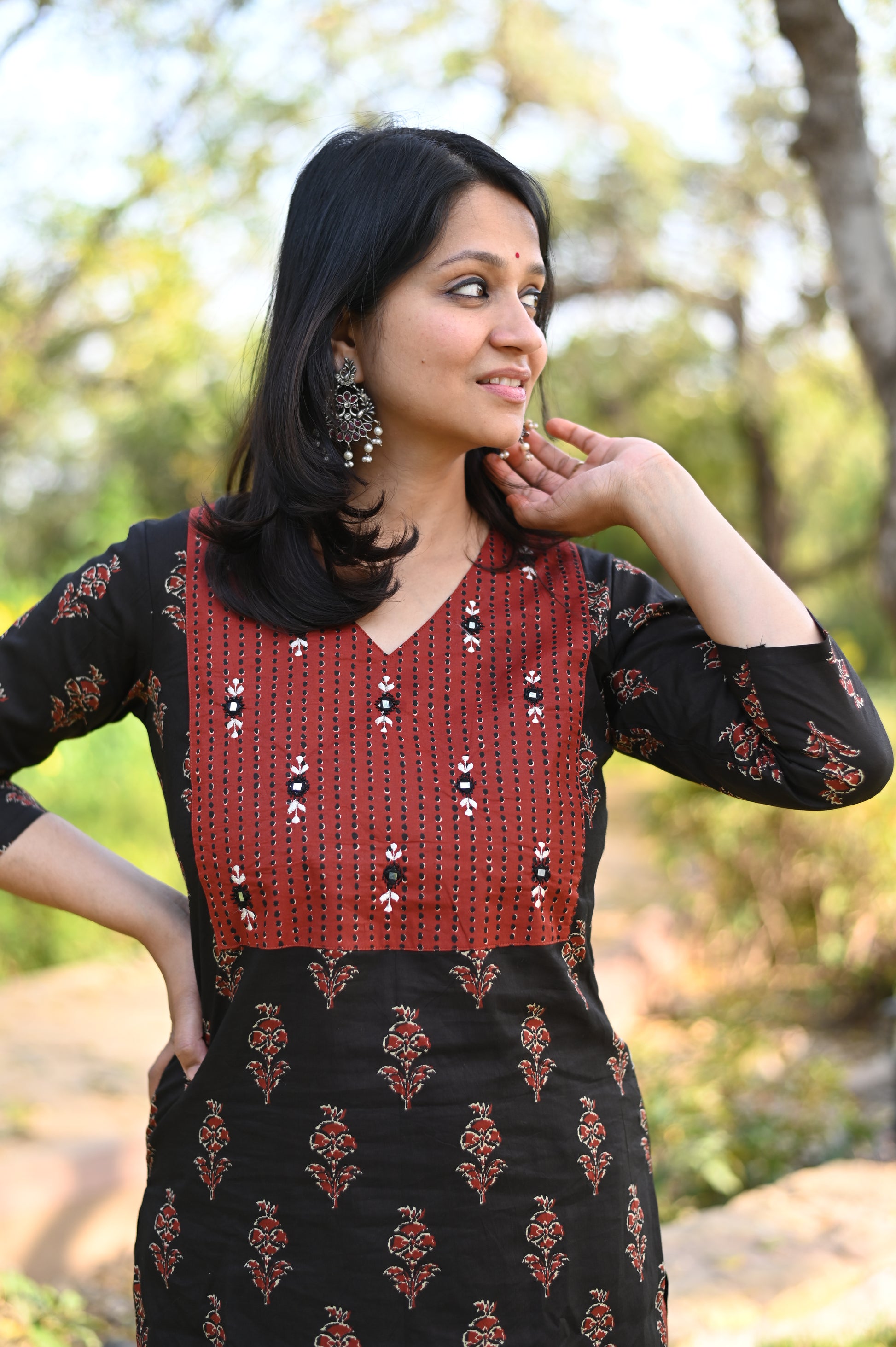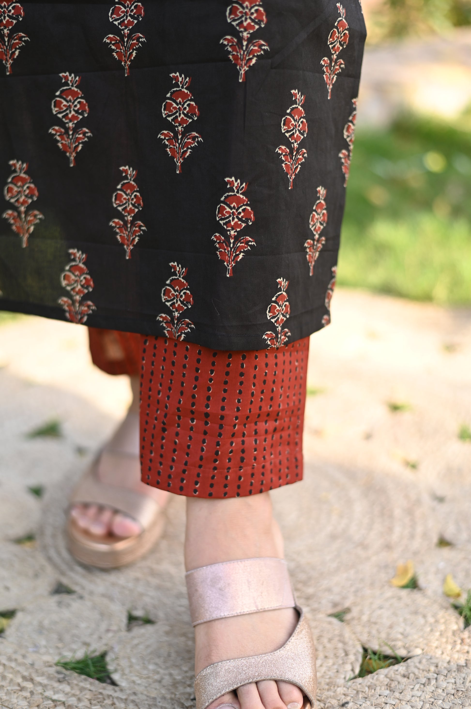 Natural-dyed colours might bleed during the first few washes or rub against the skin & other light-coloured garments. In the artful process of hand block-printing, embroidery work and stitching, variations are likely to come into existence. These irregularities are the hallmark of all handmade products and give each style a unique identity.