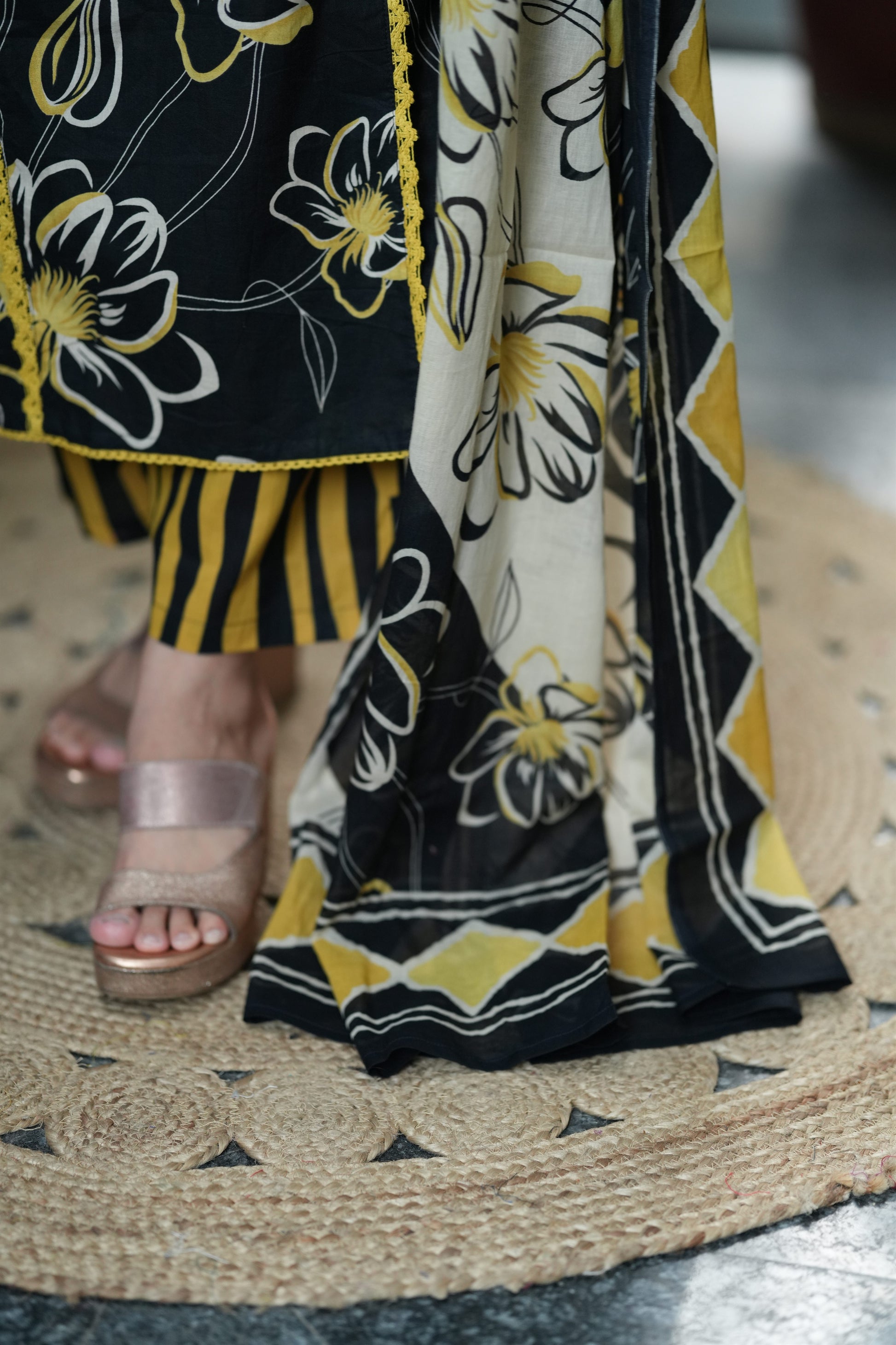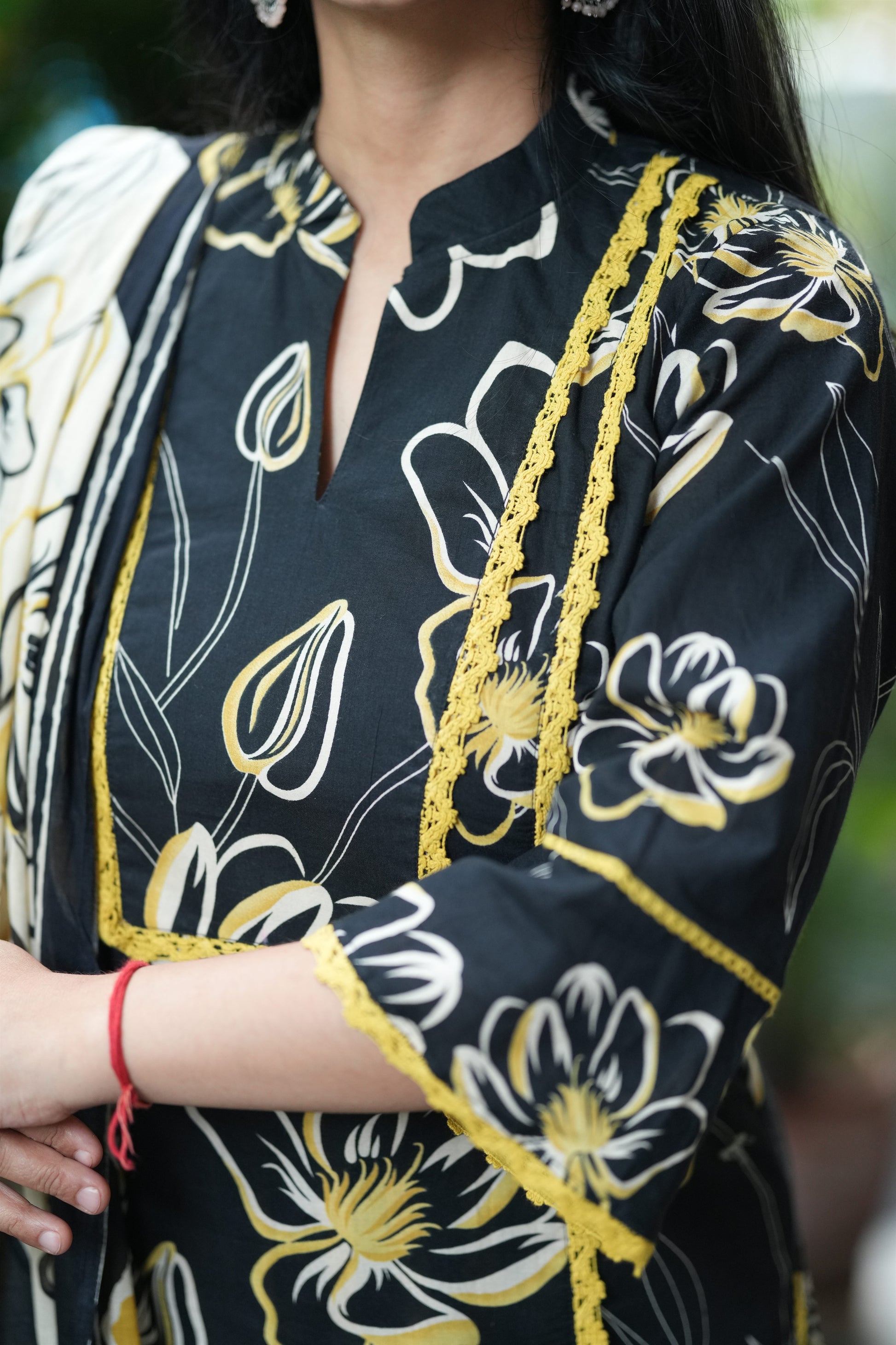 The Black–Yellow Floral Cotton Suit Set blends bold contrast with everyday elegance. Crafted in pure cotton, it features a smart collar neck and airy bell sleeves for easy movement. The outfit is highlighted with delicate crochet-style detailing that frames the floral hand-printed pattern beautifully. Paired with a coordinated dupatta and striped bottoms, it creates a refined, office-friendly look.